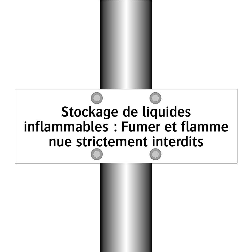 Panneau d'interdiction avec le texte : "Stockage de liquides inflammables : Fumer et flamme nue strictement interdits"
