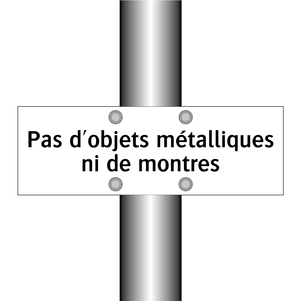Panneau d'interdiction avec le texte : "Pas d'objets métalliques ni de montres"