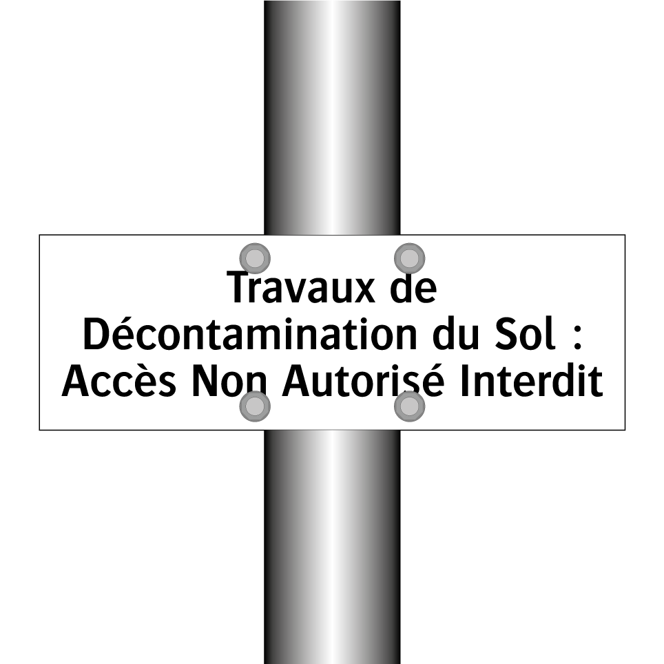 Panneau d'interdiction avec le texte : "Travaux de Décontamination du Sol : Accès Non Autorisé Interdit"
