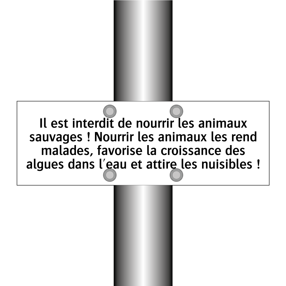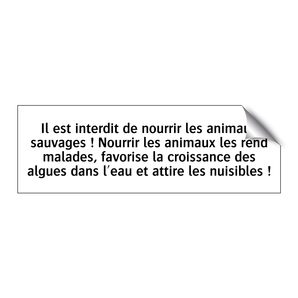 Panneau d'interdiction avec le texte : "Il est interdit de nourrir les animaux sauvages ! Nourrir les animaux les rend malades, favorise la croissance des algues dans l'eau et attire les nuisibles !"