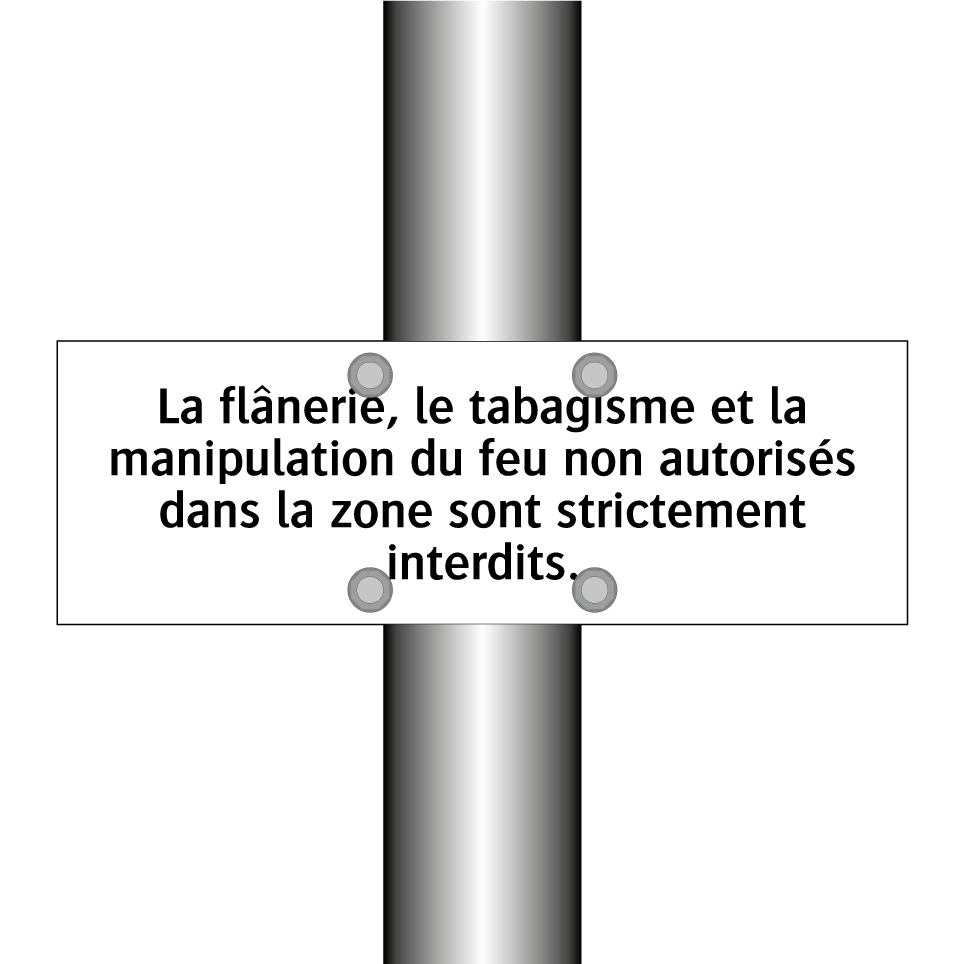 Cette pancarte de signalisation interdit strictement les activités telles que la flânerie, le tabagisme et l'utilisation non autorisée du feu dans la zone désignée. Elle est idéale pour être placée dans des lieux publics tels que les parcs, les jardins ou les zones industrielles où la sécurité est primordiale. En installant cette signalisation, vous assurez un environnement sécurisé et respectueux des règles, prévenant ainsi les comportements indésirables et les risques potentiels. Elle sert de rappel visuel efficace pour maintenir l'ordre et la sécurité dans les espaces partagés.