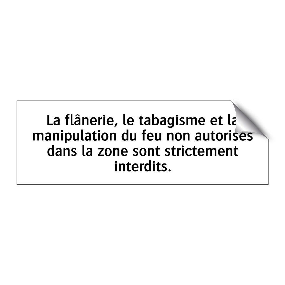 Panneau d'interdiction avec le texte : "La flânerie, le tabagisme et la manipulation du feu non autorisés dans la zone sont strictement interdits."