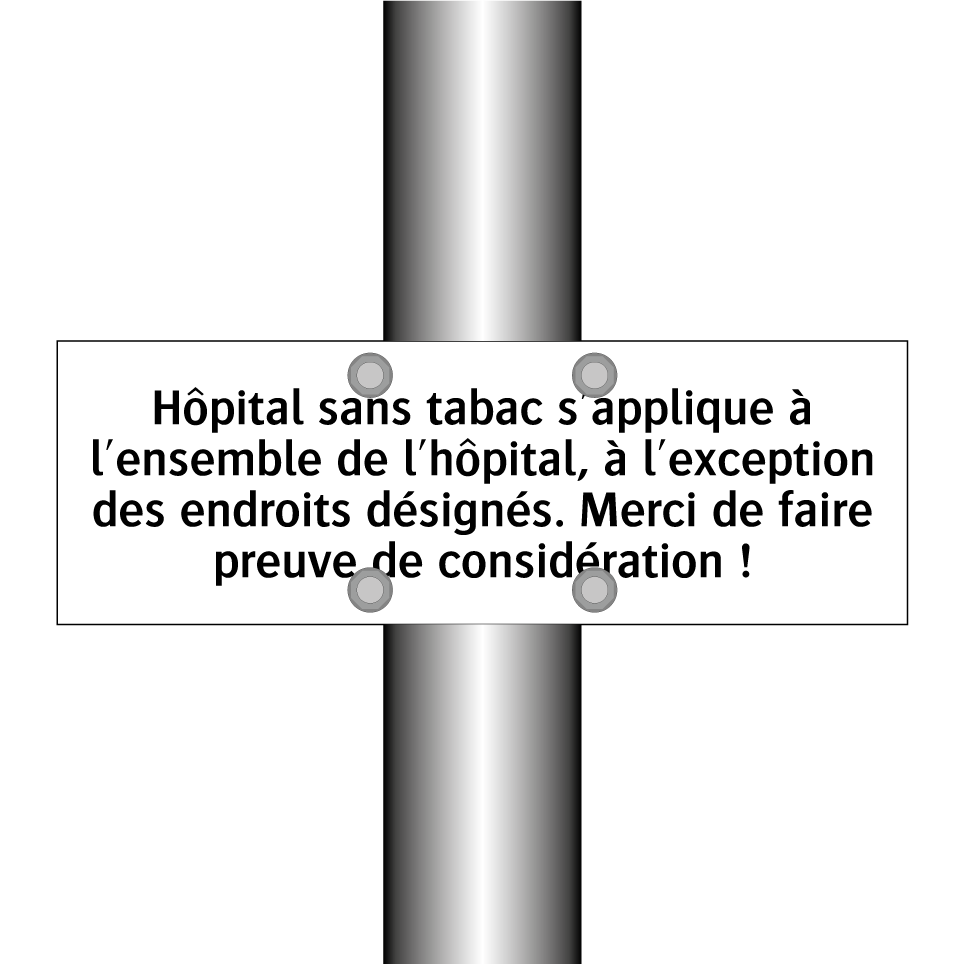 Panneau d'interdiction avec le texte : "Hôpital sans tabac s'applique à l'ensemble de l'hôpital, à l'exception des endroits désignés. Merci de faire preuve de considération !"