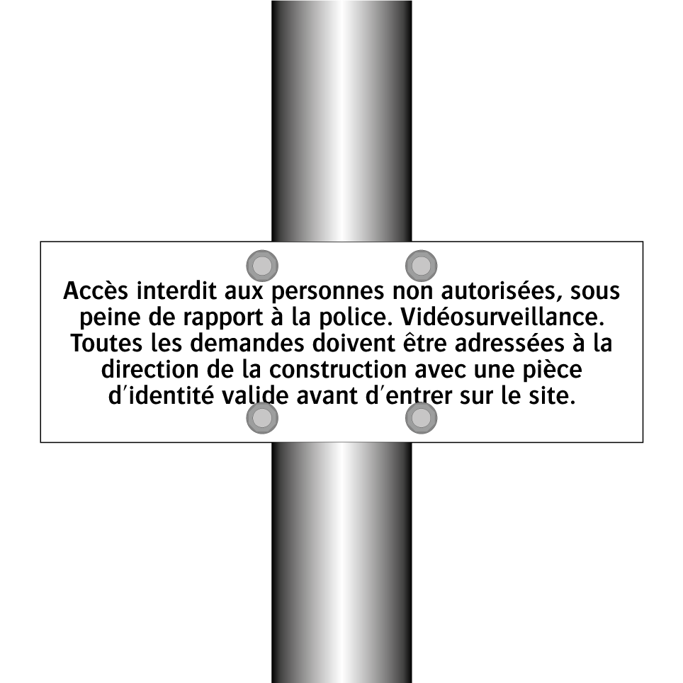Panneau d'interdiction avec le texte : "Accès interdit aux personnes non autorisées, sous peine de rapport à la police. Vidéosurveillance. Toutes les demandes doivent être adressées à la direction de la construction avec une pièce d'identité valide avant d'entrer sur le site."