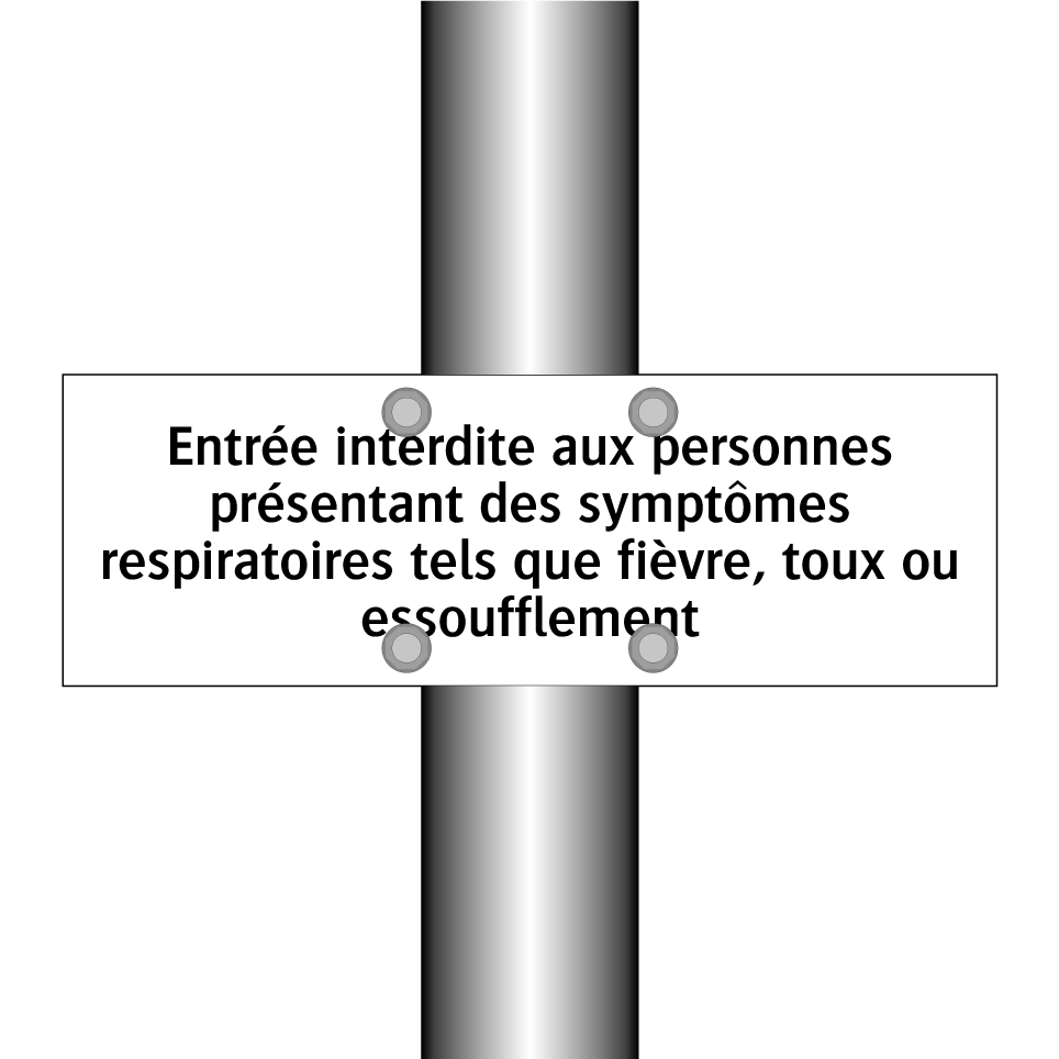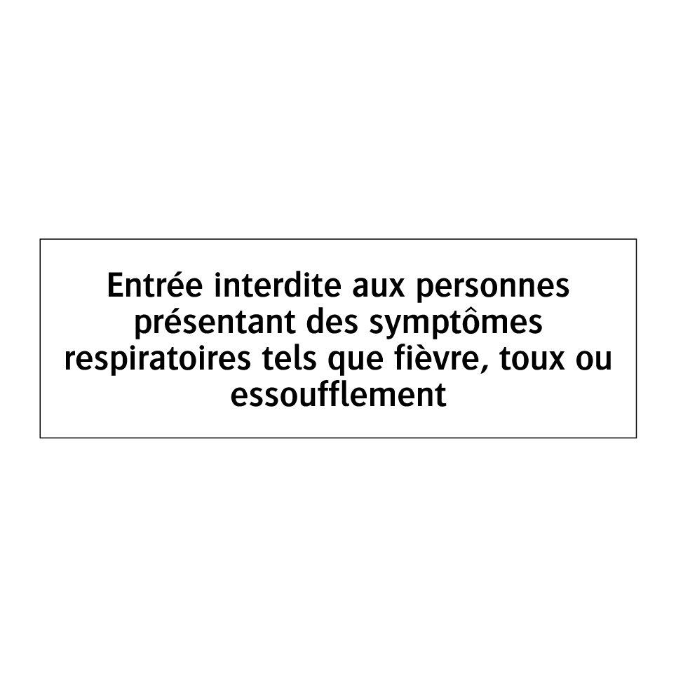 Panneau d'interdiction avec le texte : "Entrée interdite aux personnes présentant des symptômes respiratoires tels que fièvre, toux ou essoufflement"