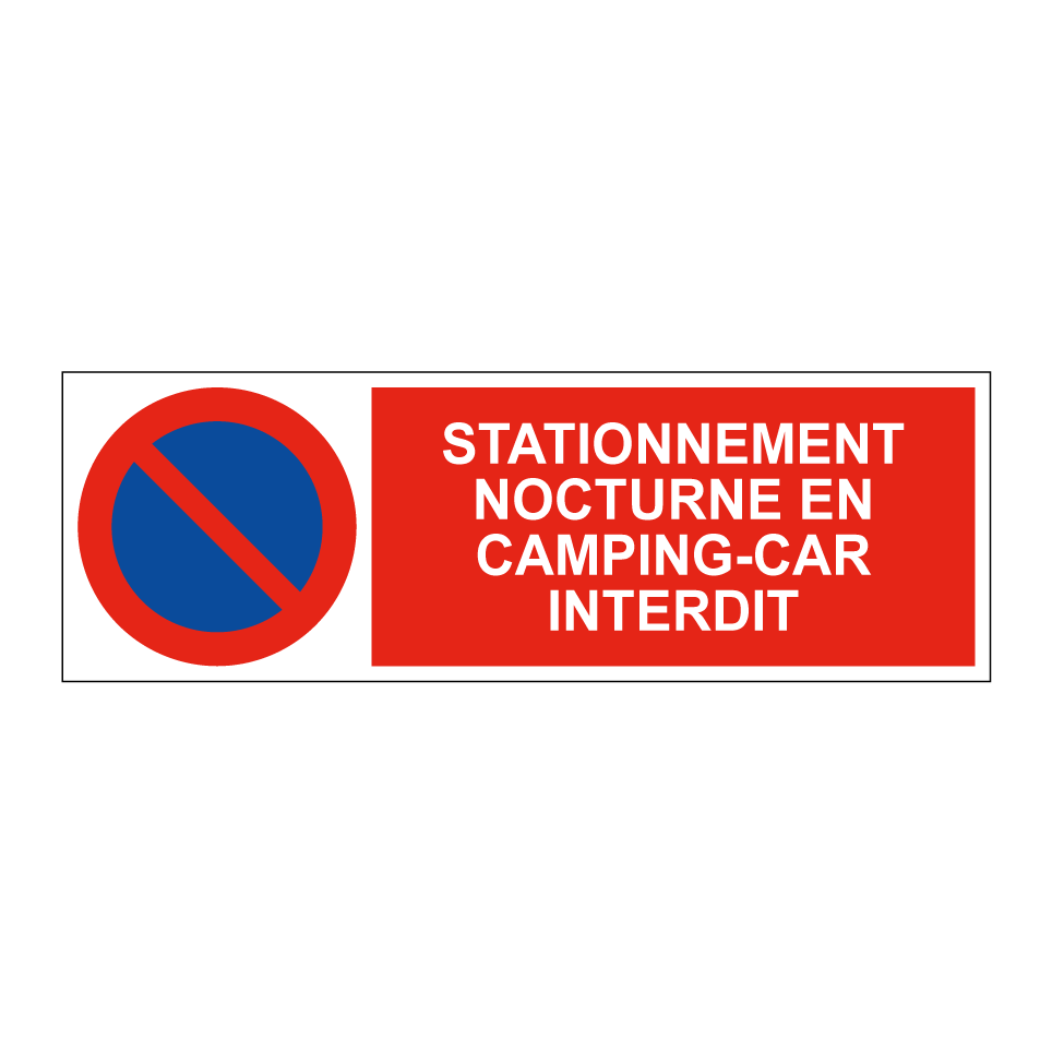 Panneau d'interdiction de stationner avec le texte : "Stationnement nocturne en camping-car interdit" et une symbolique claire.