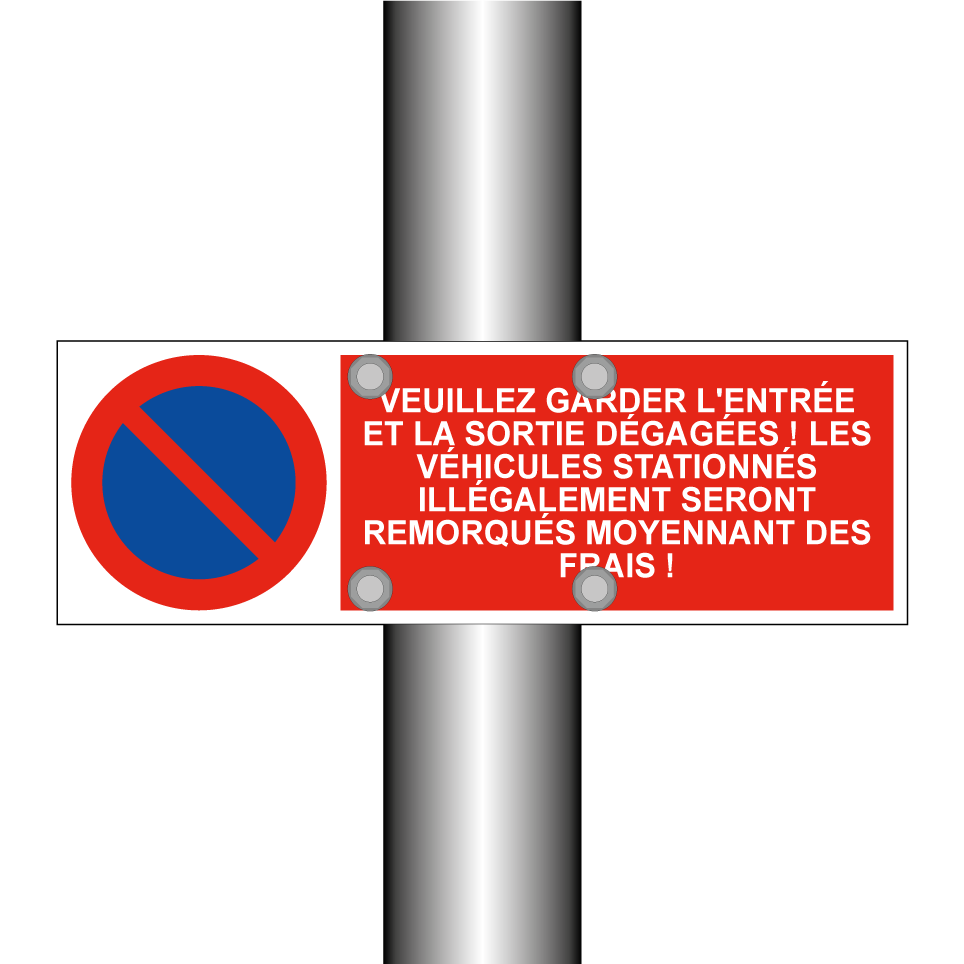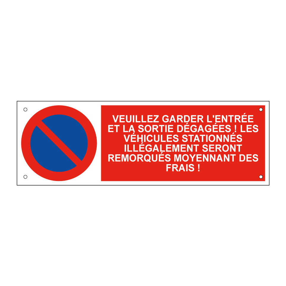 Panneau d'interdiction de stationner avec le texte : "Veuillez garder l'entrée et la sortie dégagées ! Les véhicules stationnés illégalement seront remorqués moyennant des frais !" et une symbolique claire.