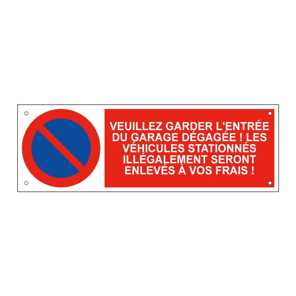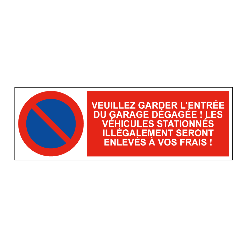 Panneau d'interdiction de stationner avec le texte : "Veuillez garder l'entrée du garage dégagée ! Les véhicules stationnés illégalement seront enlevés à vos frais !" et une symbolique claire.