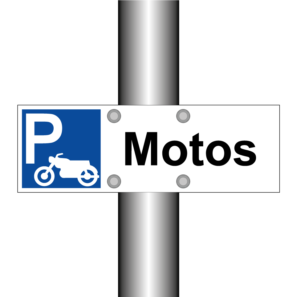 Panneau de stationnement avec le texte : "Motos" et une symbolique claire.