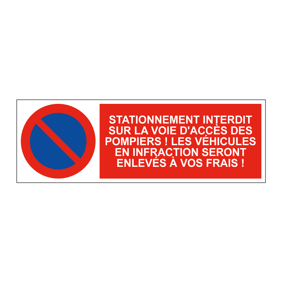 Panneau d'interdiction de stationner avec le texte : "Stationnement interdit sur la voie d'accès des pompiers ! Les véhicules en infraction seront enlevés à vos frais !" et une symbolique claire.