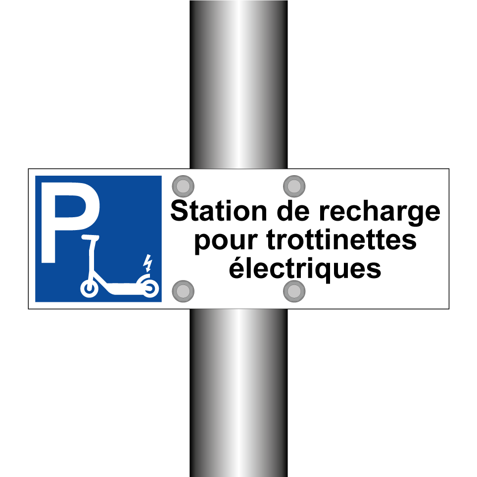 Panneau de stationnement avec le texte : "Station de recharge pour trottinettes électriques" et une symbolique claire.