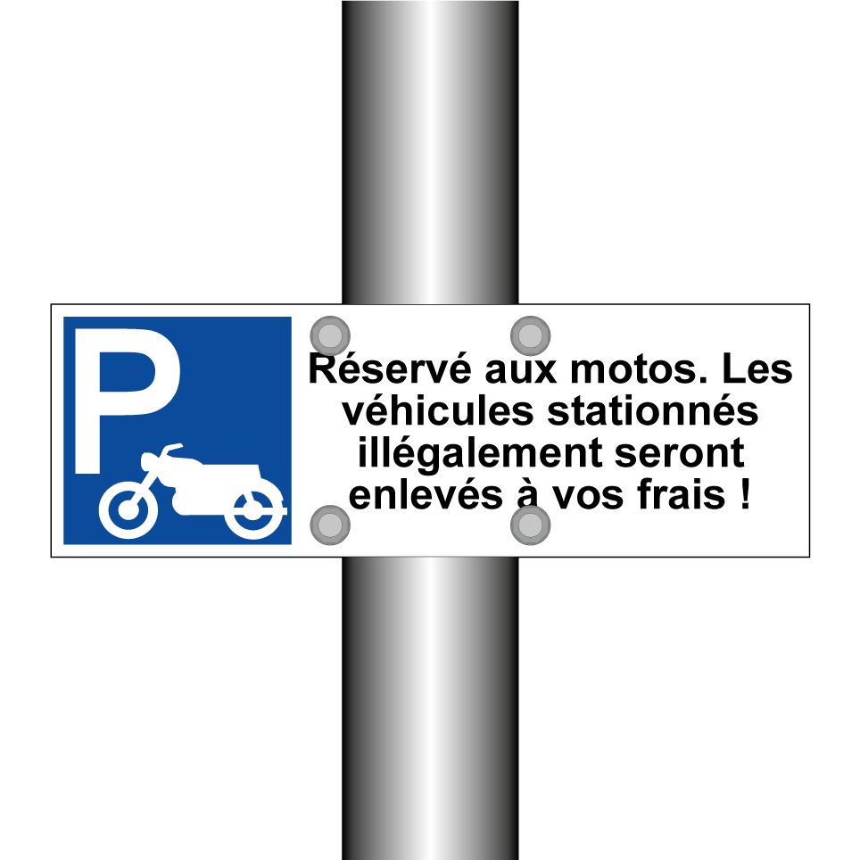 Panneau de stationnement avec le texte : "Réservé aux motos. Les véhicules stationnés illégalement seront enlevés à vos frais !" et une symbolique claire.