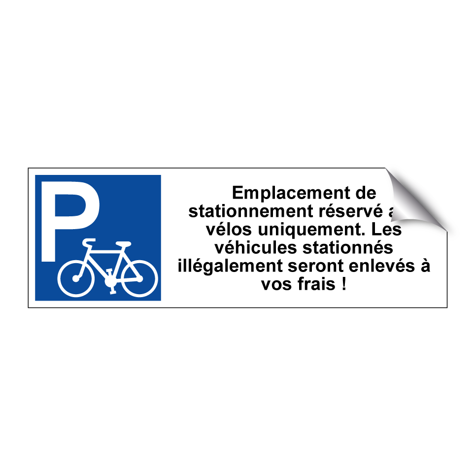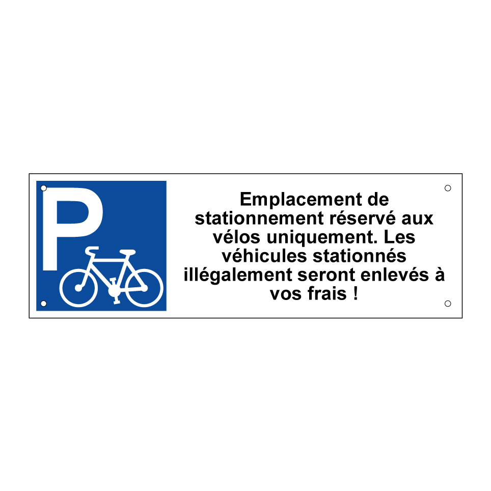Panneau de stationnement avec le texte : "Emplacement de stationnement réservé aux vélos uniquement. Les véhicules stationnés illégalement seront enlevés à vos frais !" et une symbolique claire.