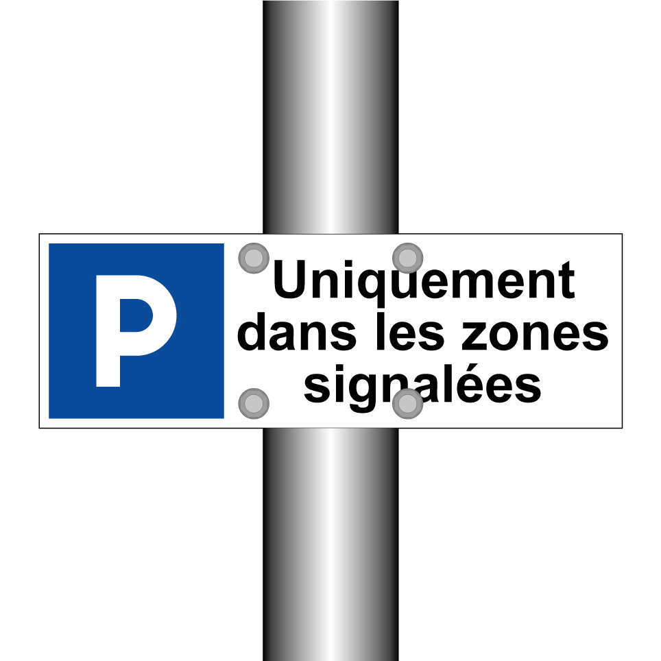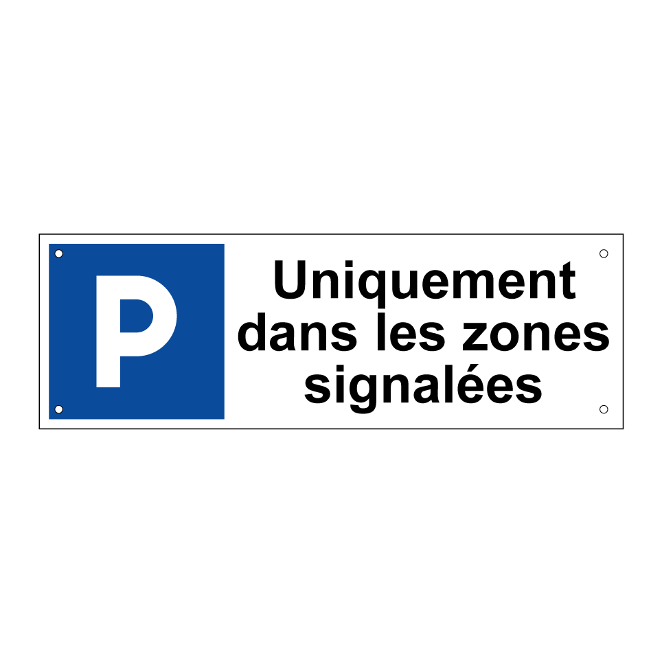 Panneau de stationnement avec le texte : "Uniquement dans les zones signalées" et une symbolique claire.