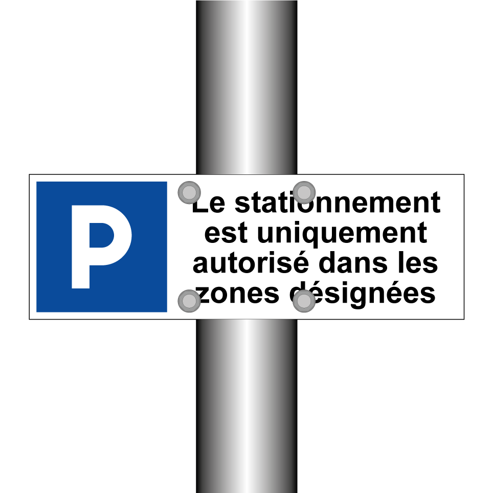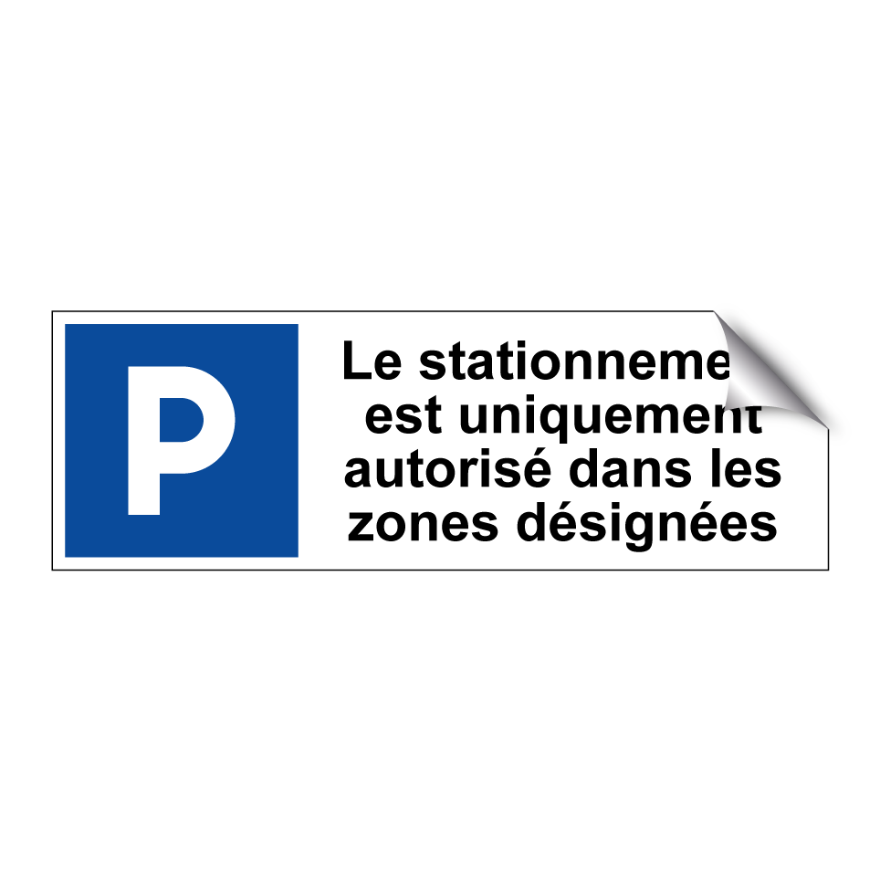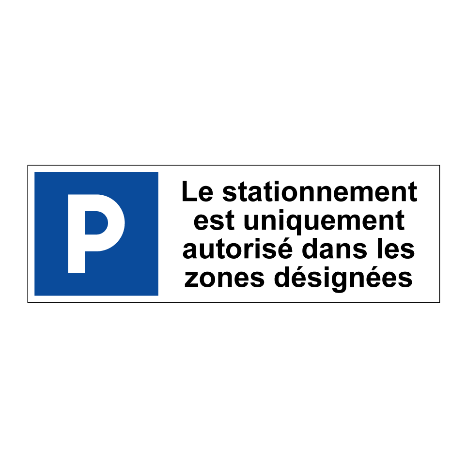 Panneau de stationnement avec le texte : "Le stationnement est uniquement autorisé dans les zones désignées" et une symbolique claire.