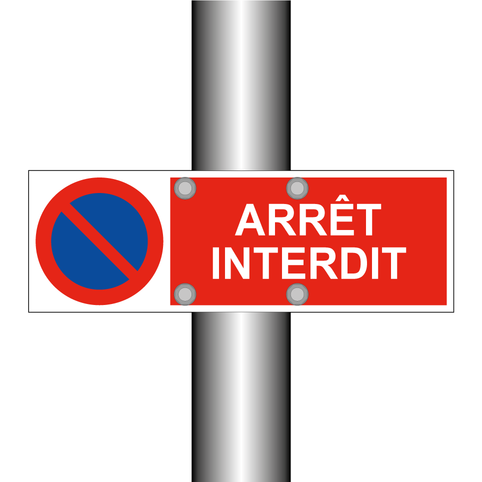 Panneau d'interdiction de stationner avec le texte : "Arrêt interdit" et une symbolique claire.