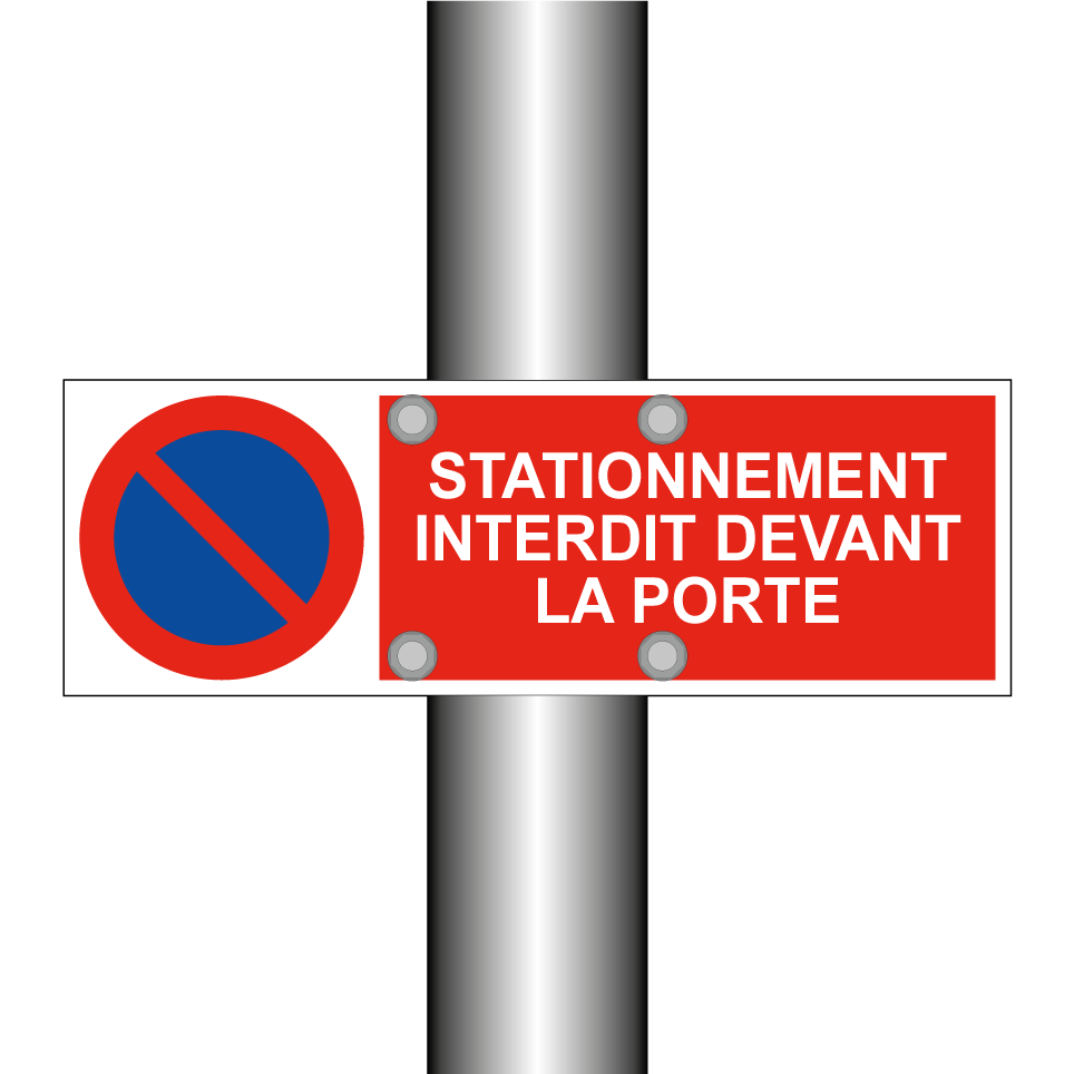Panneau d'interdiction de stationner avec le texte : "Stationnement interdit devant la porte" et une symbolique claire.