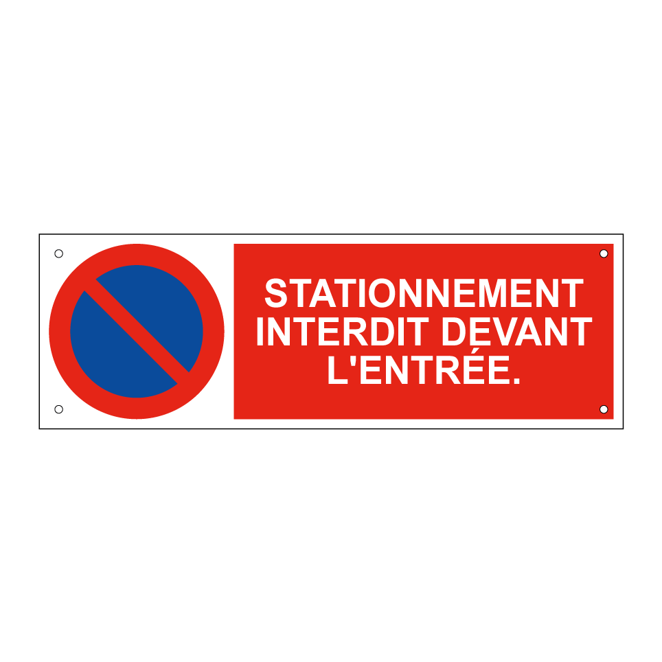 Panneau d'interdiction de stationner avec le texte : "Stationnement interdit devant l'entrée." et une symbolique claire.