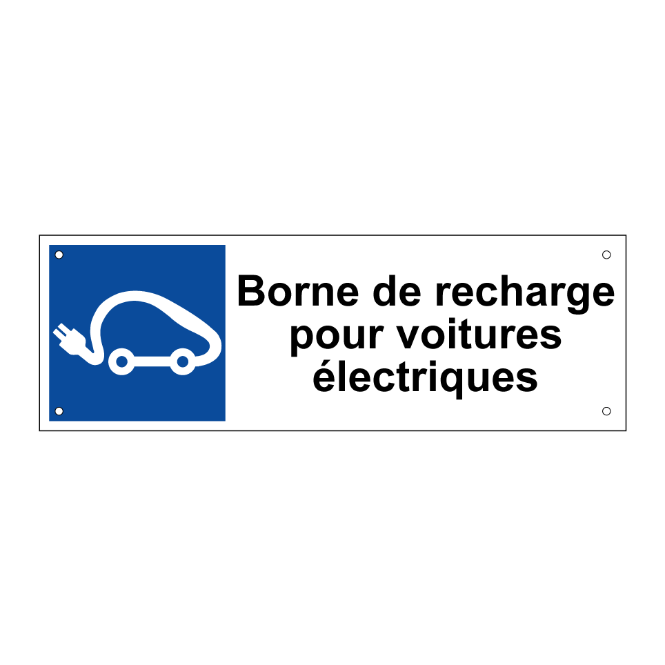 Panneau de stationnement avec le texte : "Borne de recharge pour voitures électriques" et une symbolique claire.