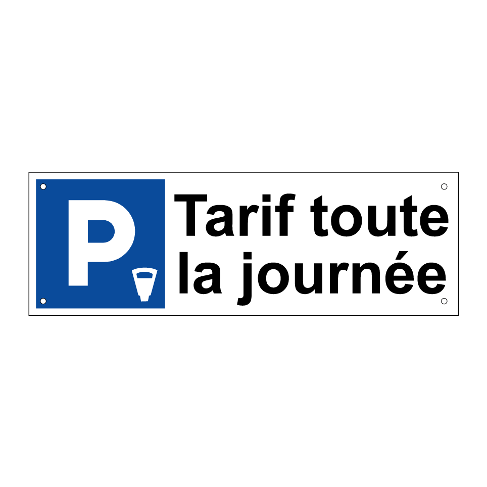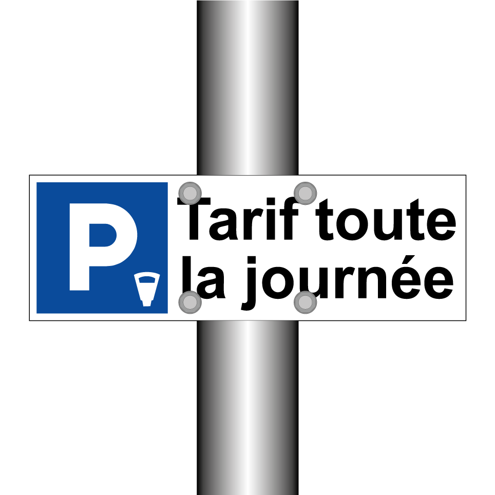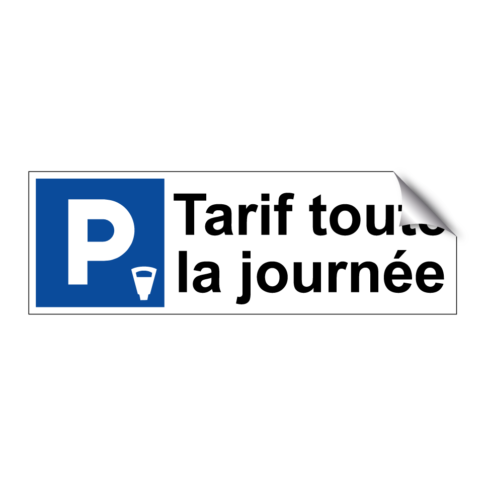 Panneau de stationnement avec le texte : "Tarif toute la journée" et une symbolique claire.