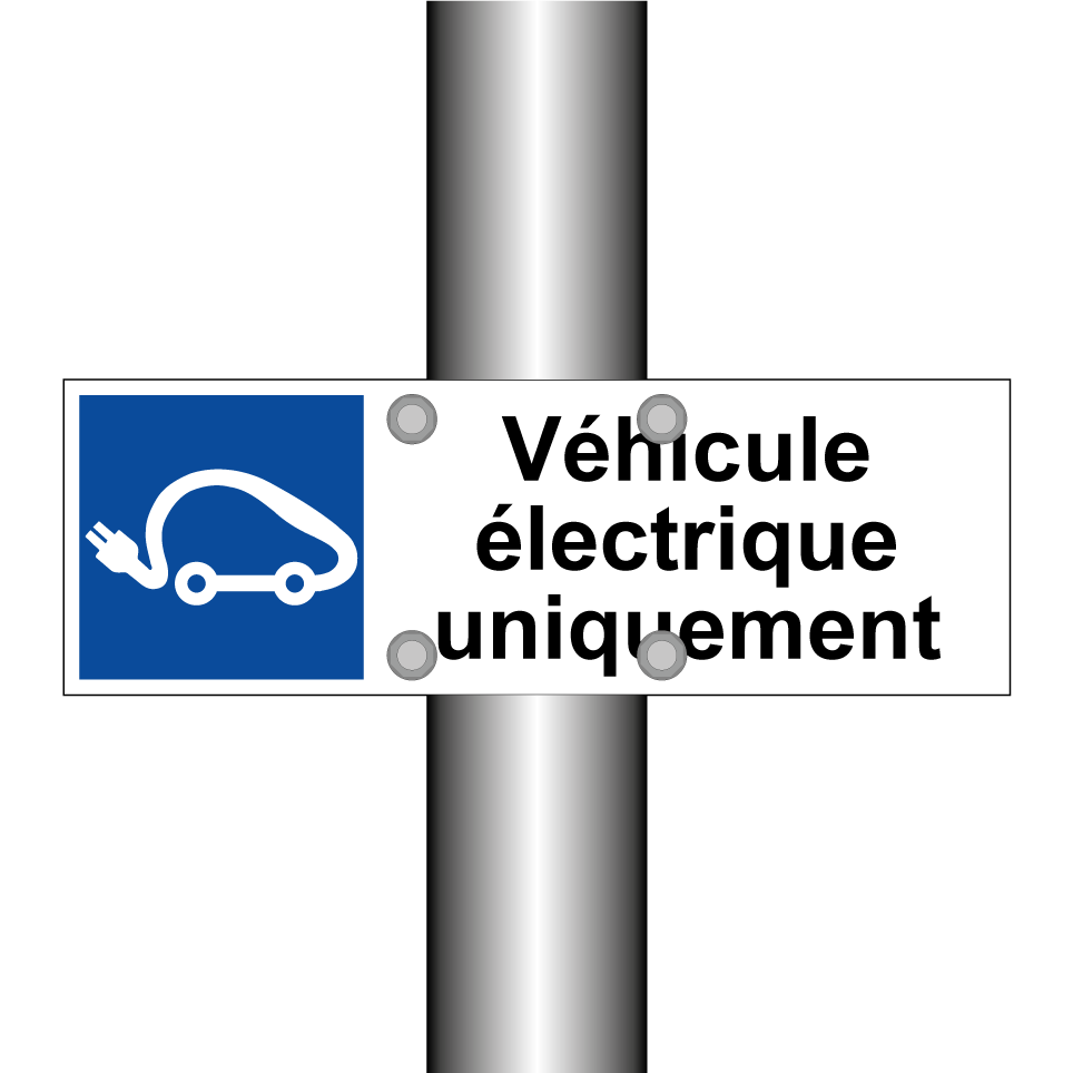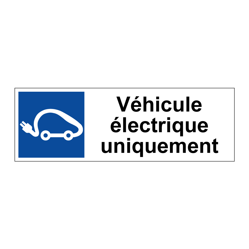 Panneau de stationnement avec le texte : "Véhicule électrique uniquement" et une symbolique claire.
