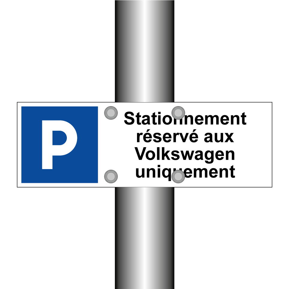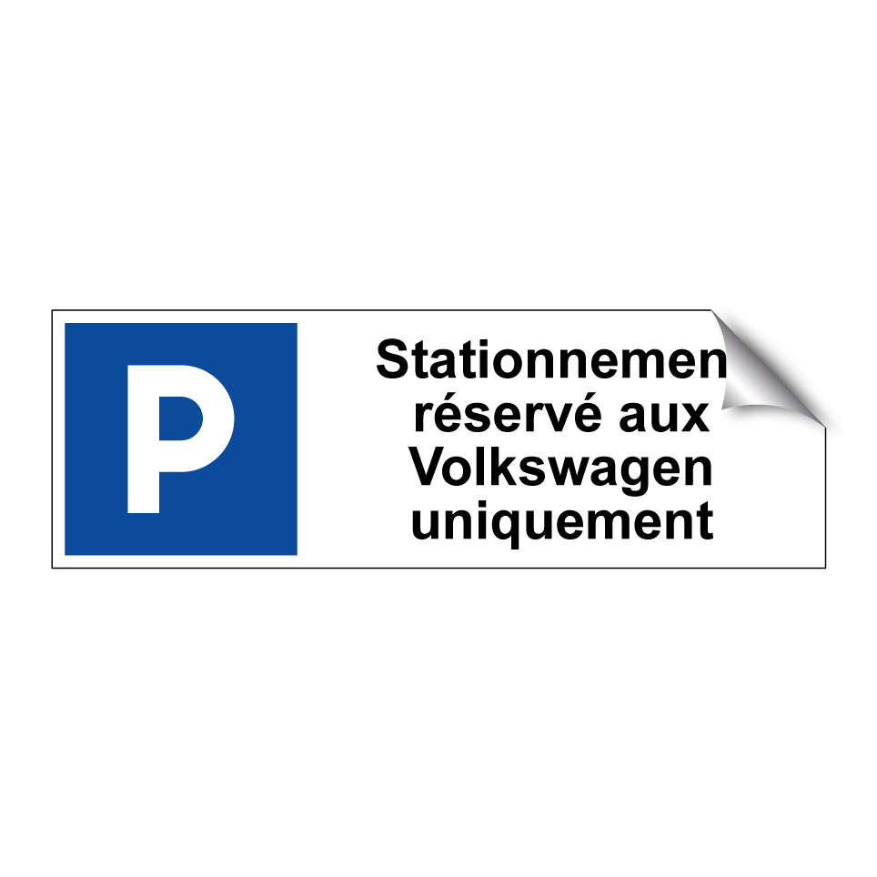 Panneau de stationnement avec le texte : "Stationnement réservé aux Volkswagen uniquement" et une symbolique claire.