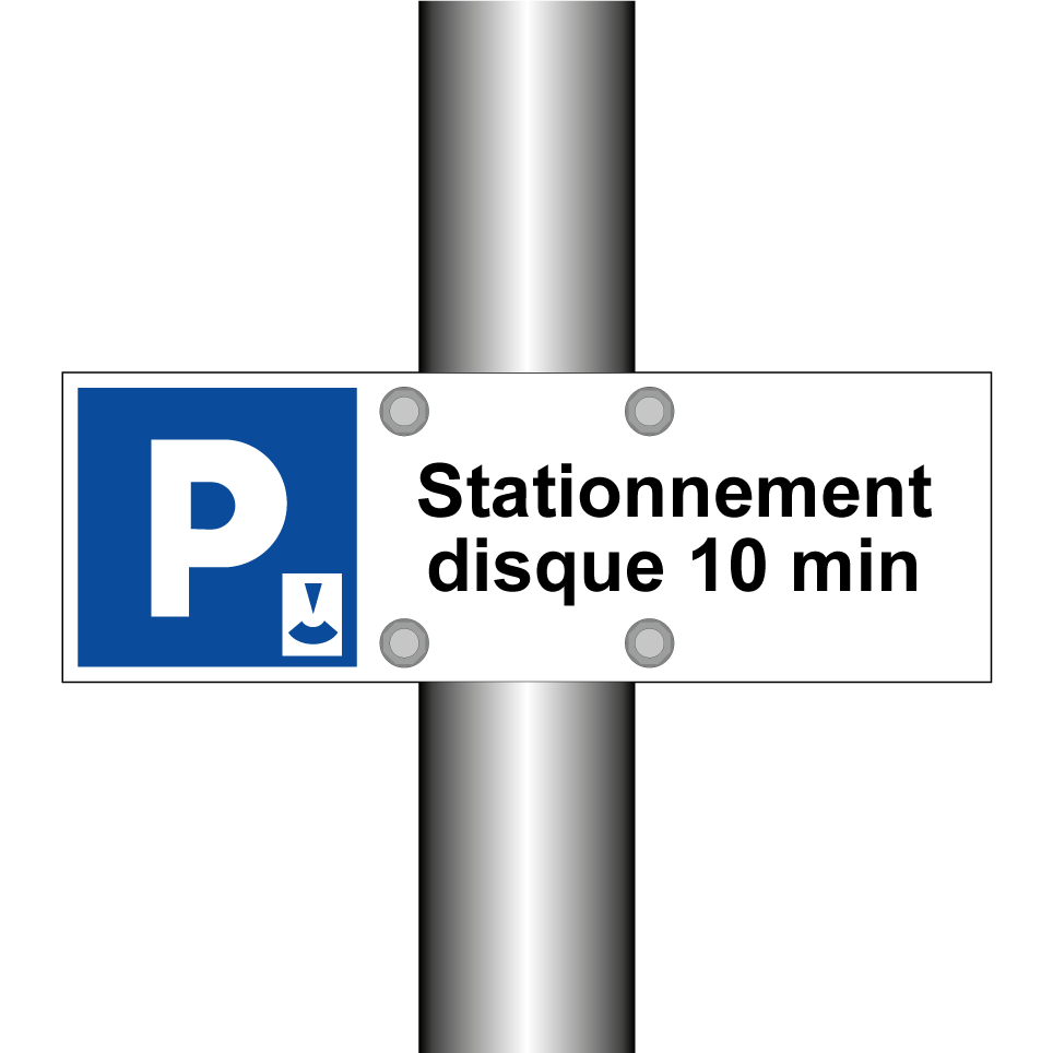 Panneau de stationnement avec le texte : "Stationnement disque 10 min" et une symbolique claire.