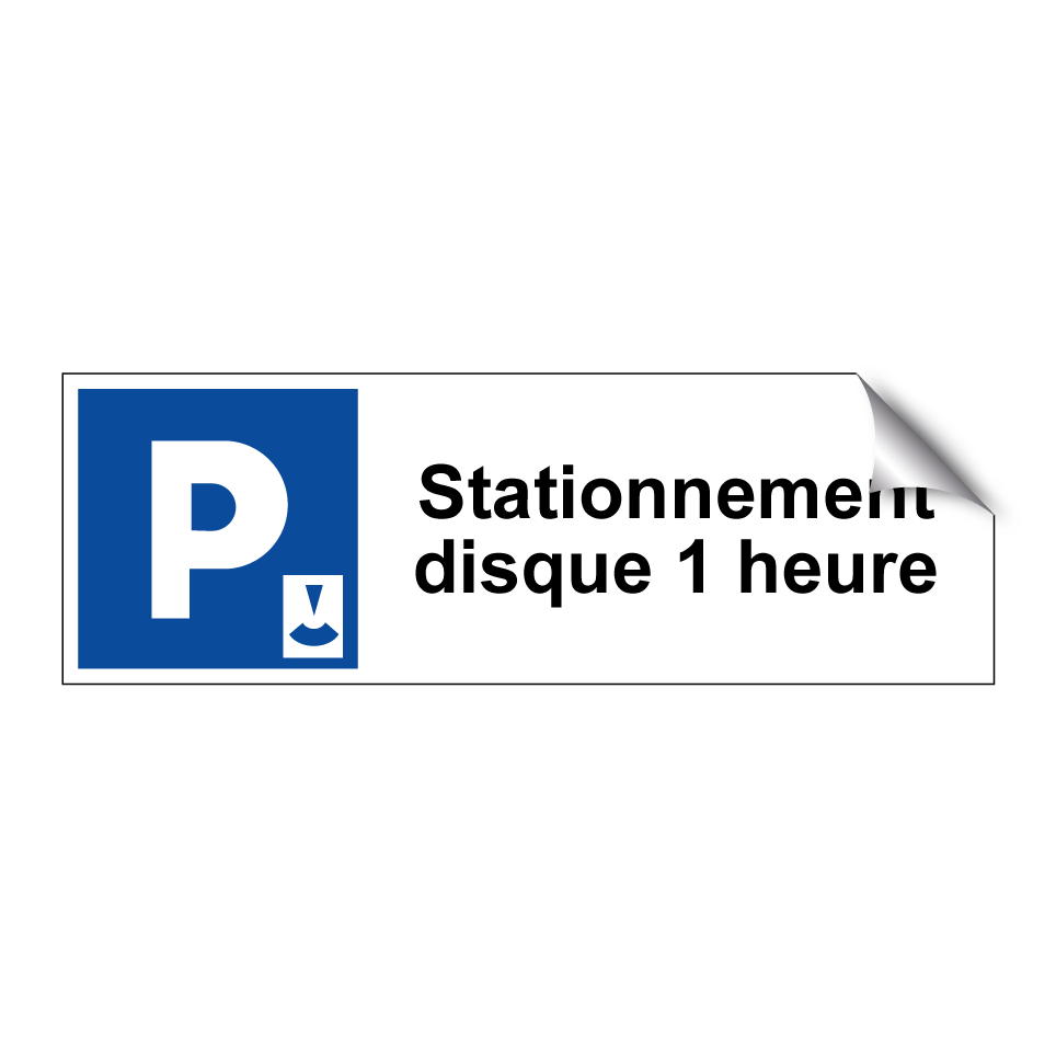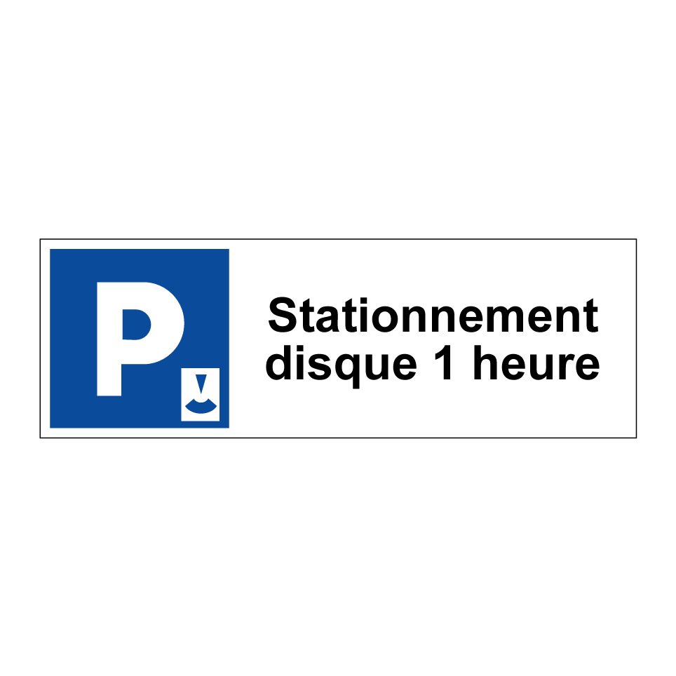 Panneau de stationnement avec le texte : "Stationnement disque 1 heure" et une symbolique claire.