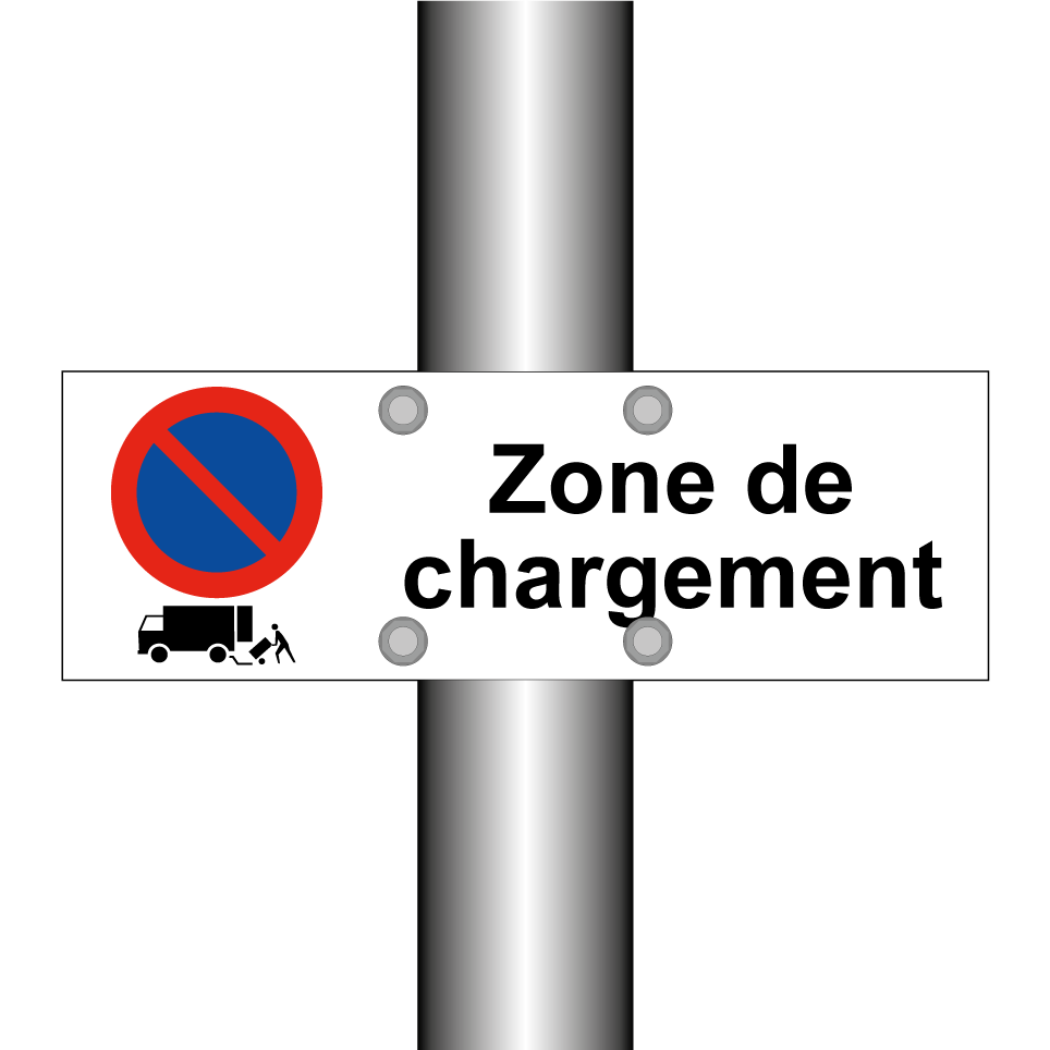 Panneau d'interdiction de stationner avec le texte : "Zone de chargement" et une symbolique claire.