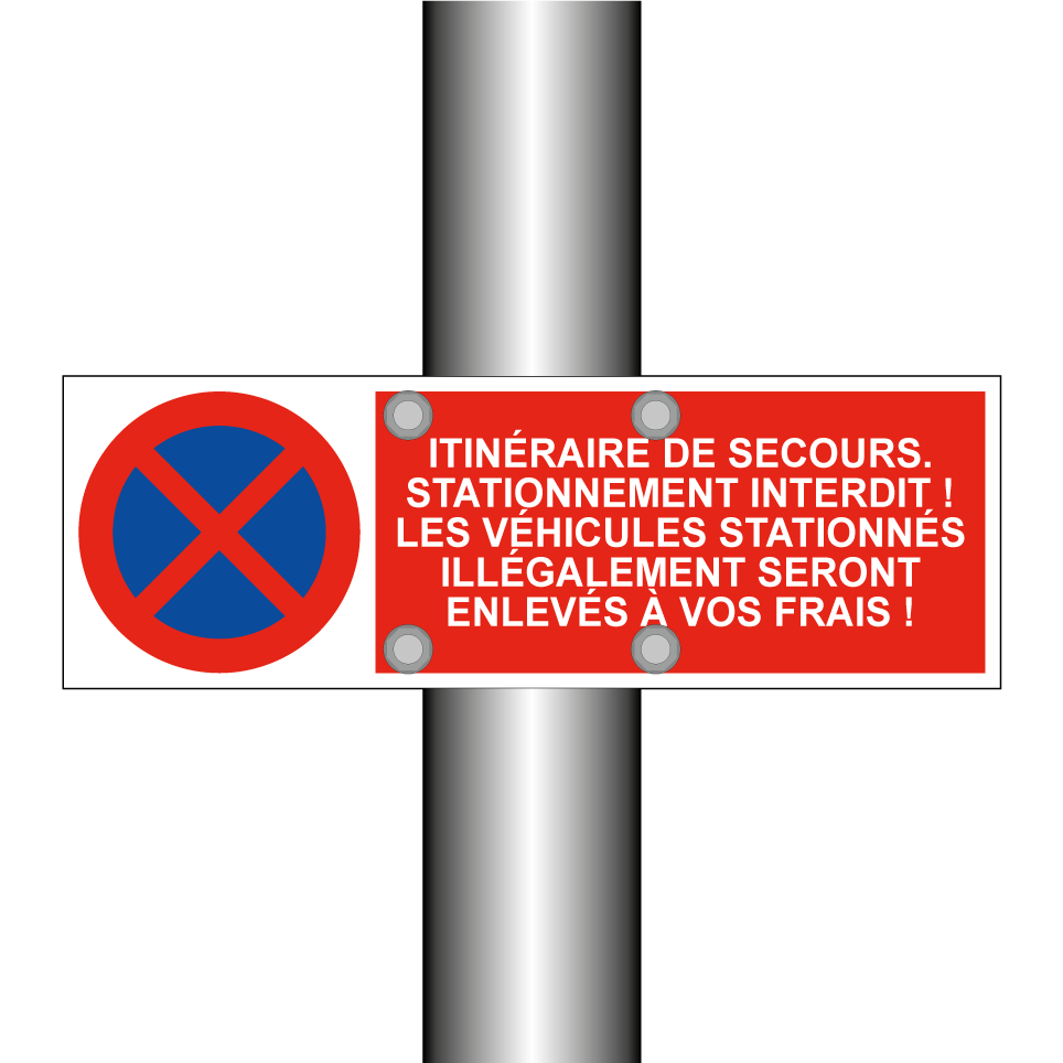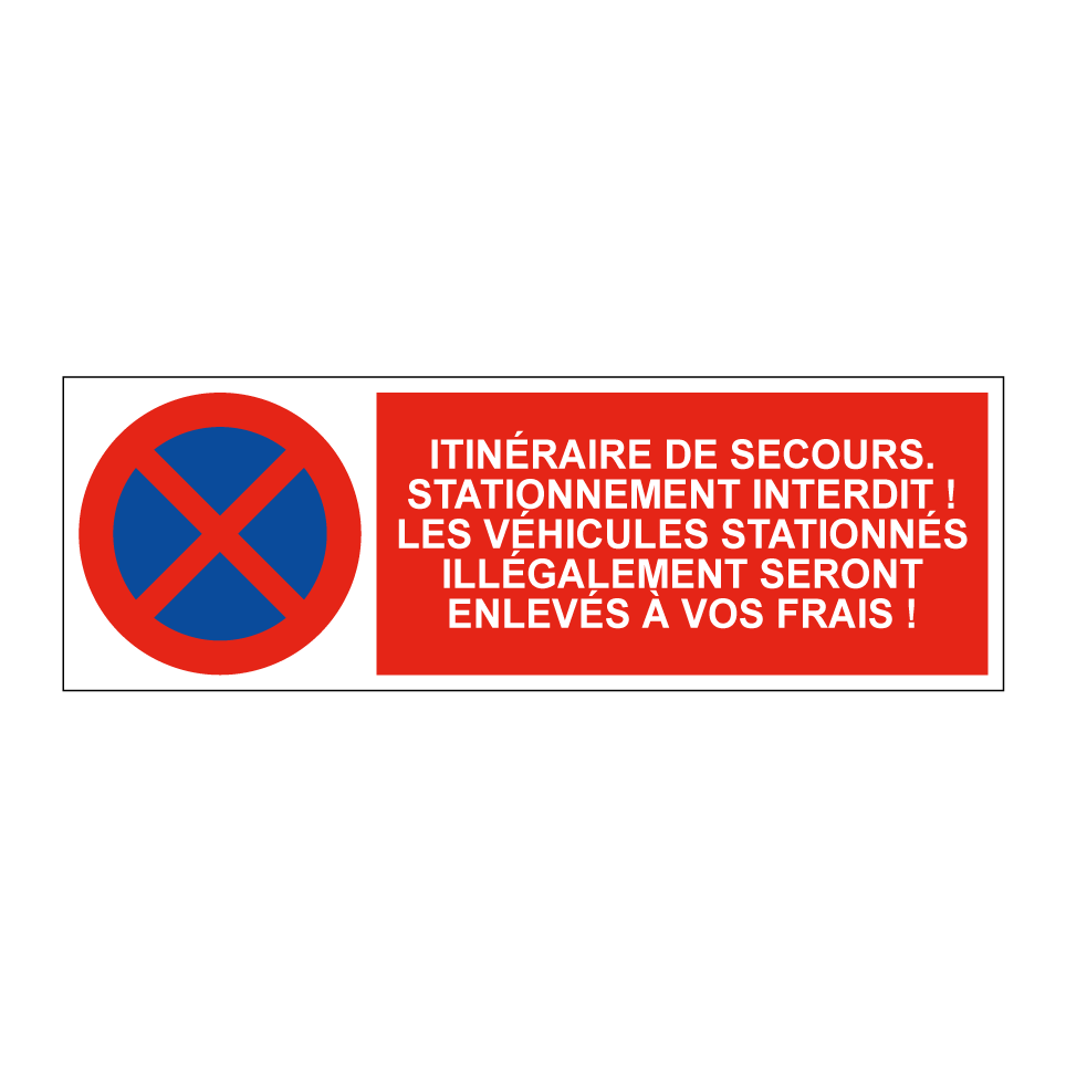 Panneau d'interdiction de stationner avec le texte : "Itinéraire de secours. Stationnement interdit ! Les véhicules stationnés illégalement seront enlevés à vos frais !" et une symbolique claire.