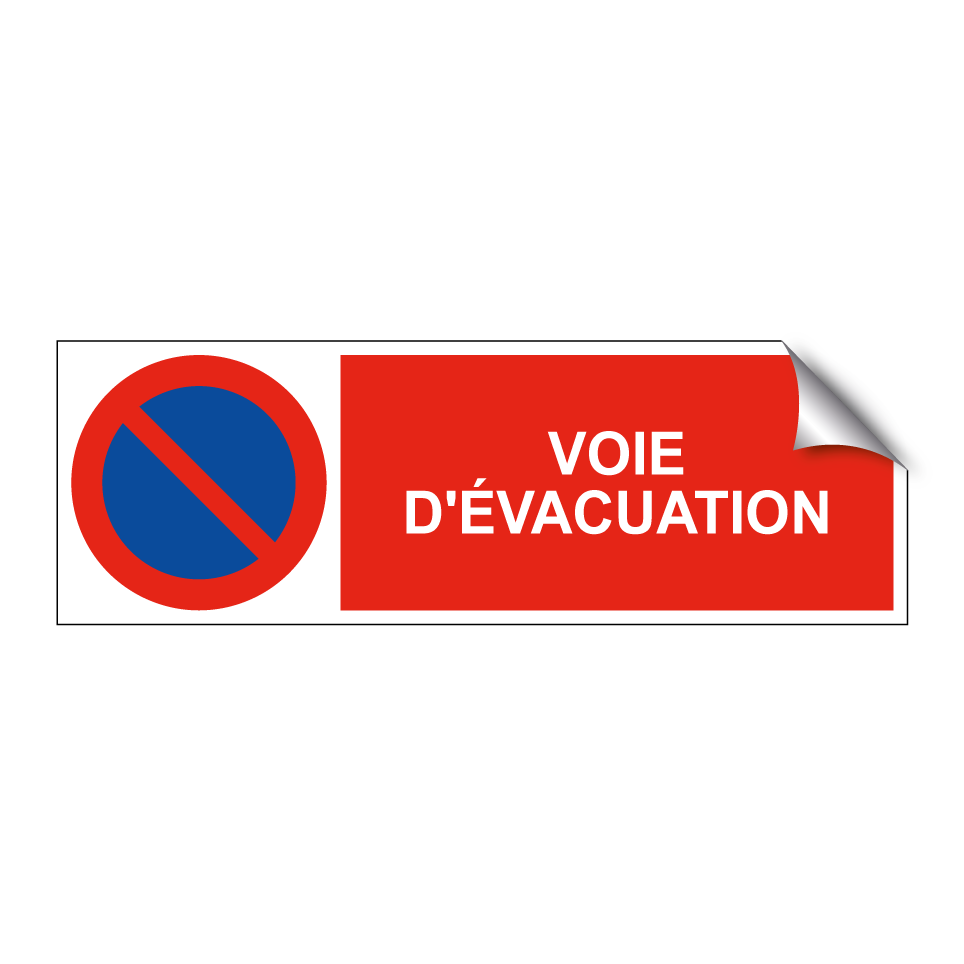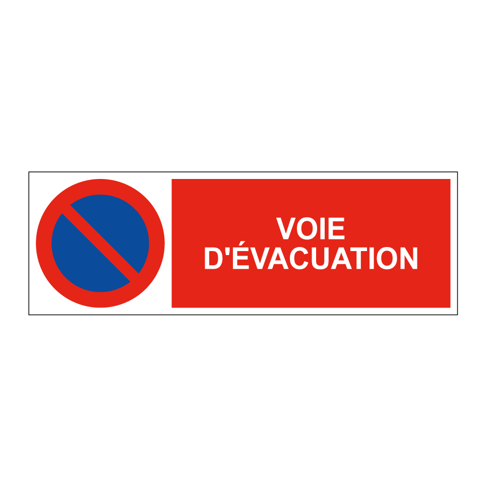 Panneau d'interdiction de stationner avec le texte : "Voie d'évacuation" et une symbolique claire.