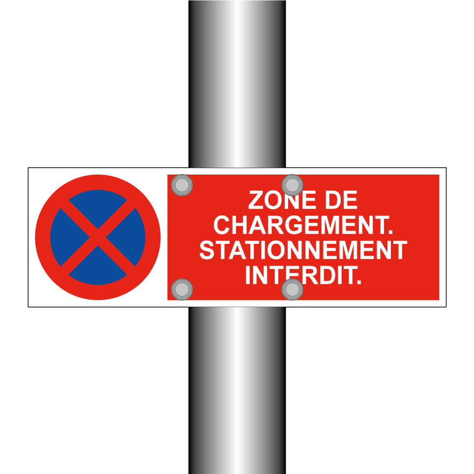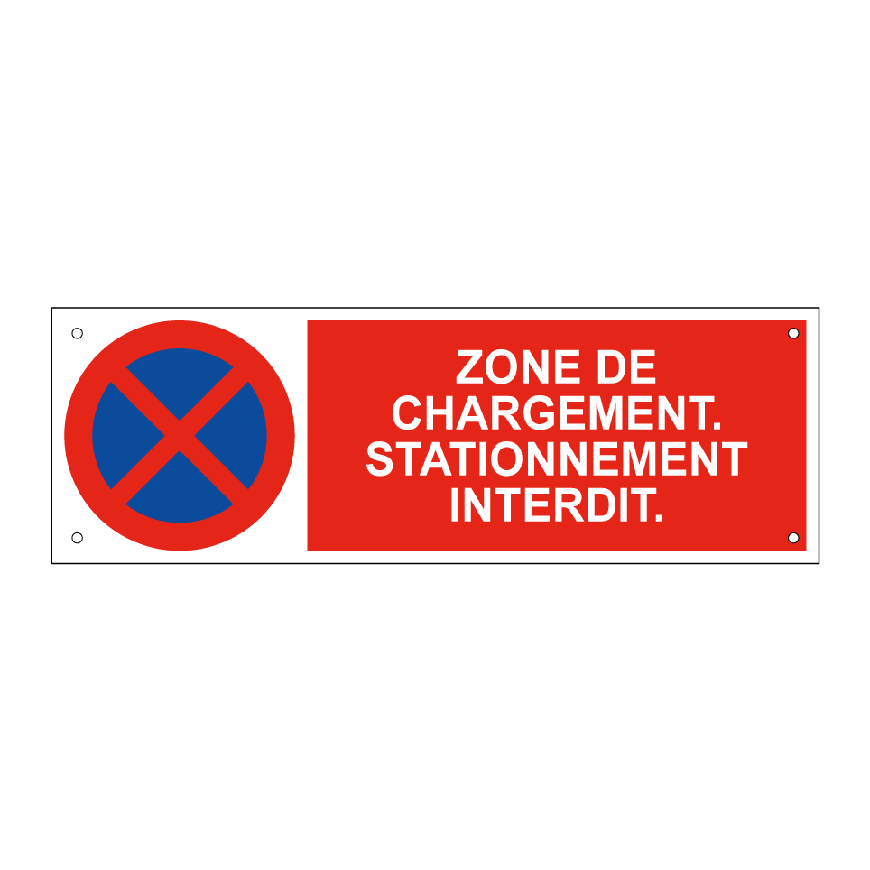 Panneau d'interdiction de stationner avec le texte : "Zone de chargement. Stationnement interdit." et une symbolique claire.