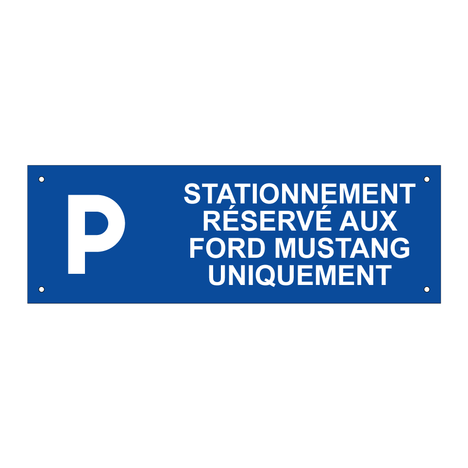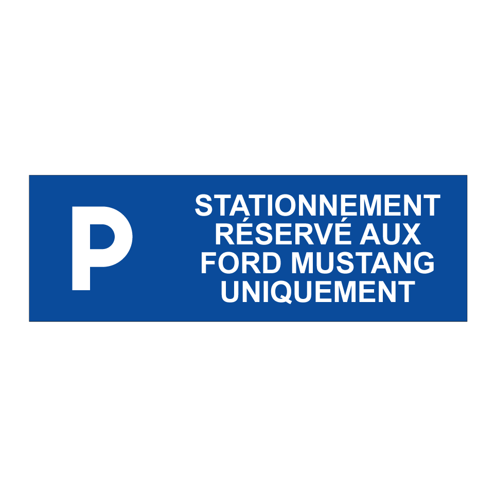 Panneau de stationnement avec le texte : "Stationnement réservé aux Ford Mustang uniquement" et une symbolique claire.