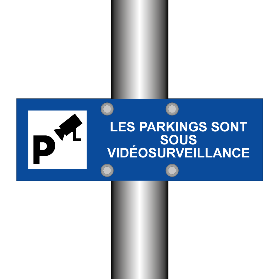 Panneau de stationnement avec le texte : "Les parkings sont sous vidéosurveillance" et une symbolique claire.