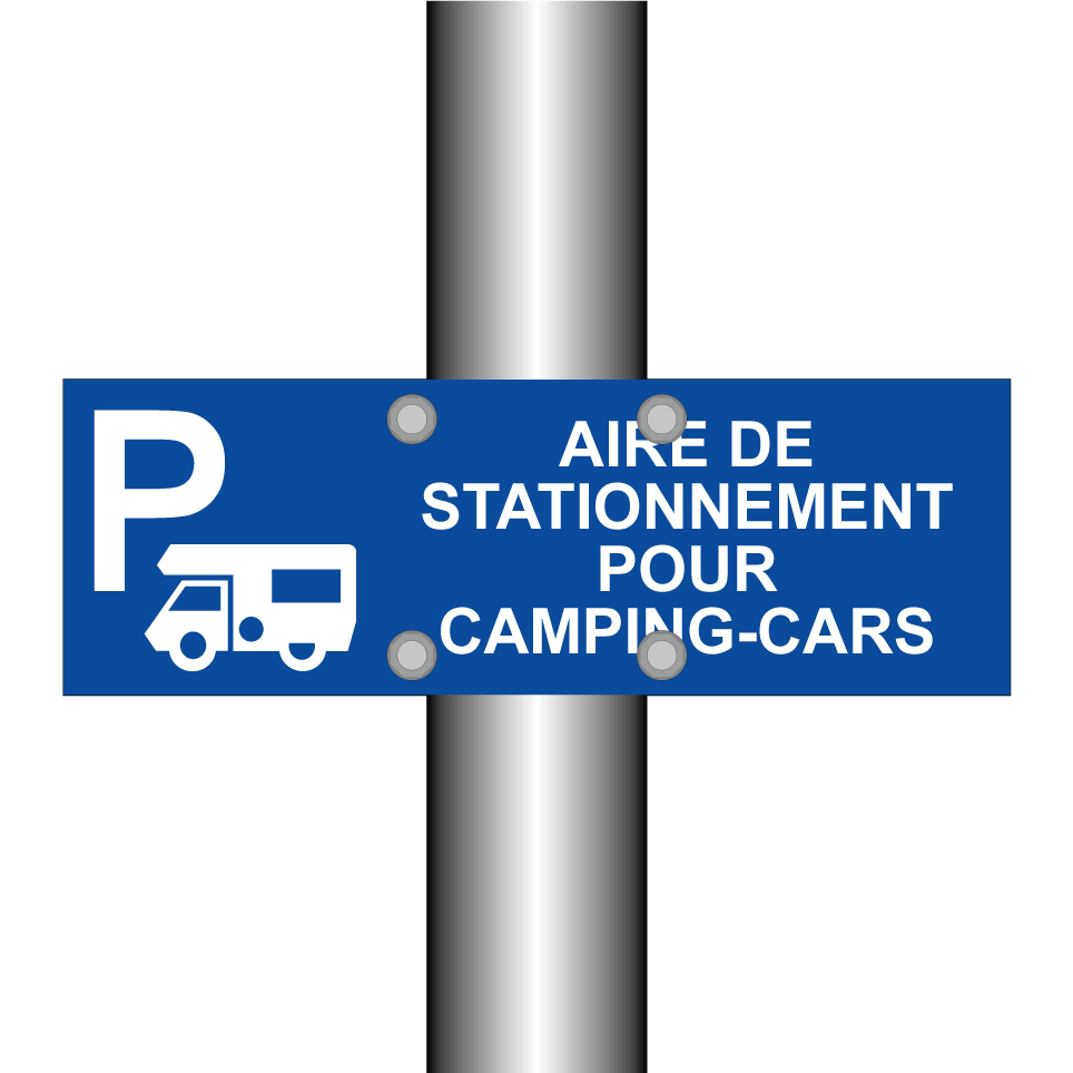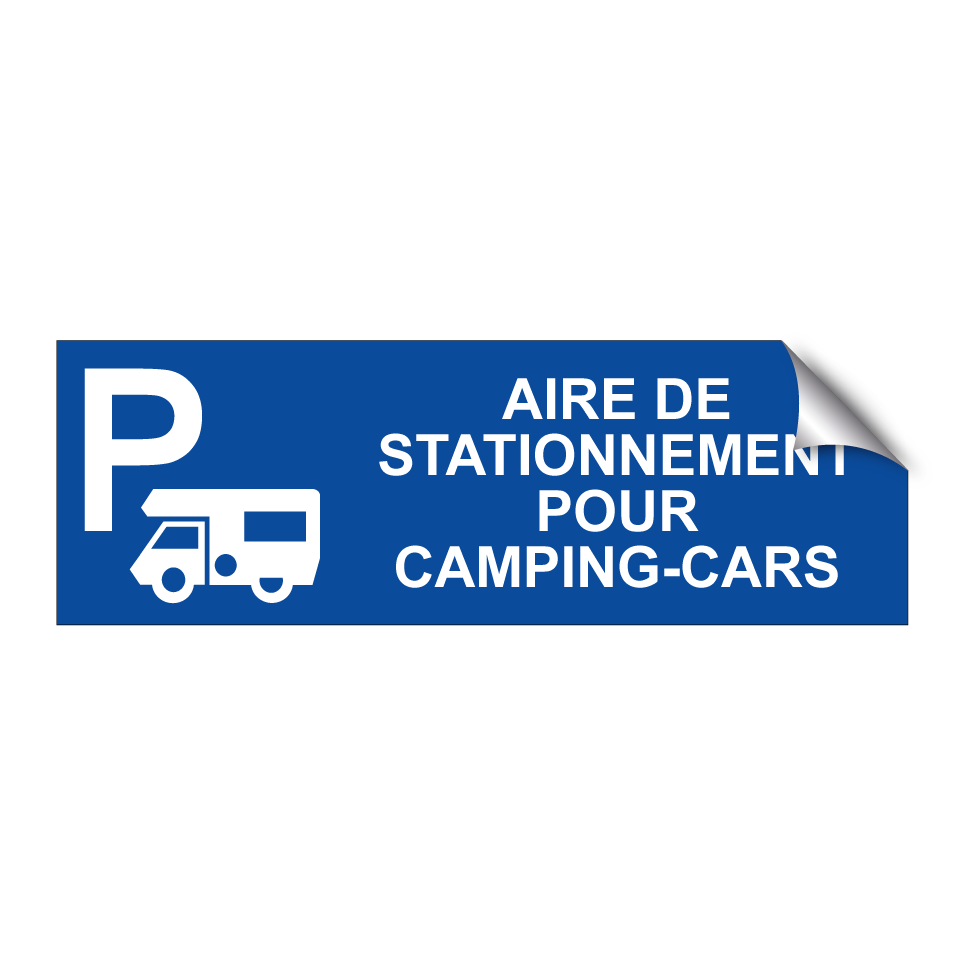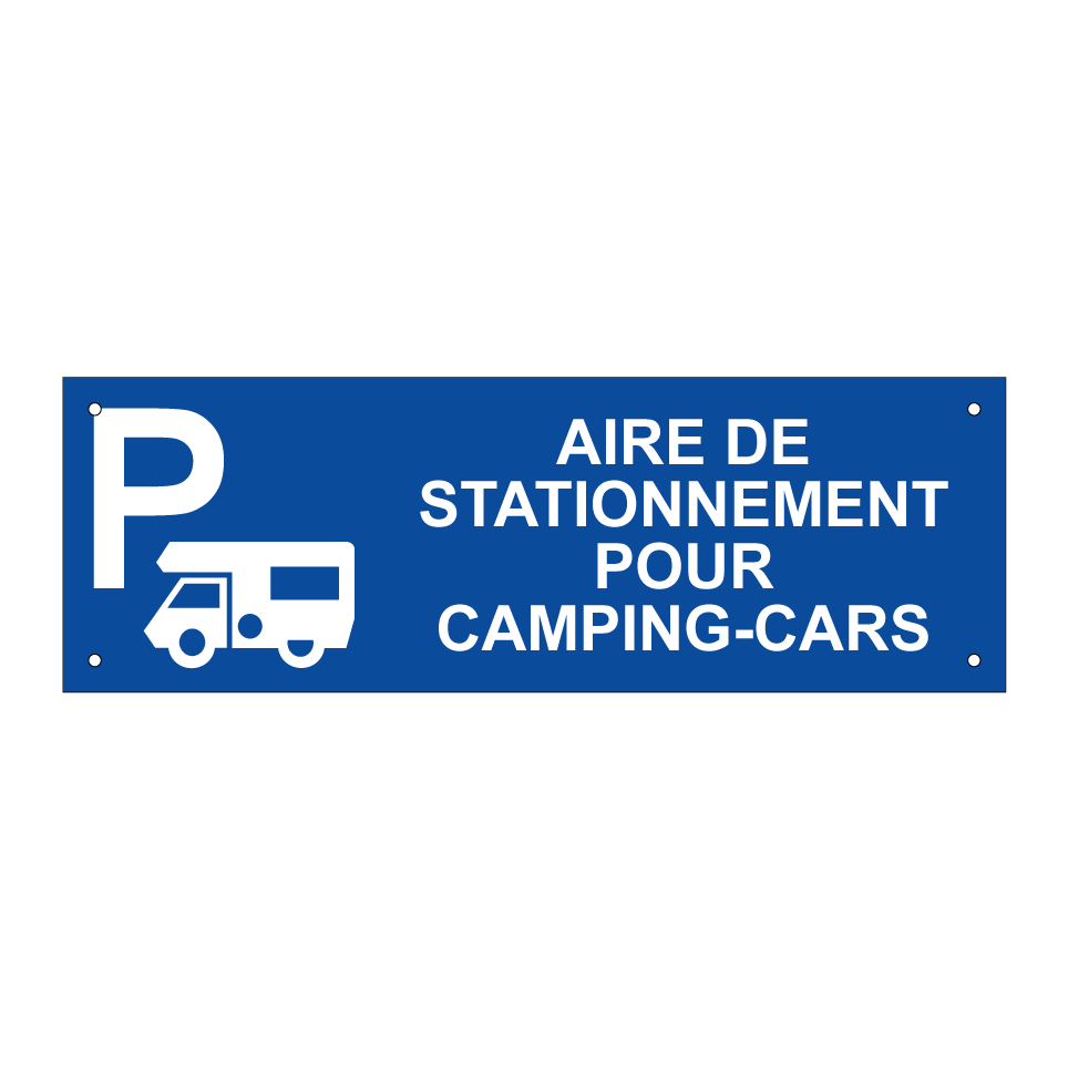 Panneau de stationnement avec le texte : "Aire de stationnement pour camping-cars" et une symbolique claire.