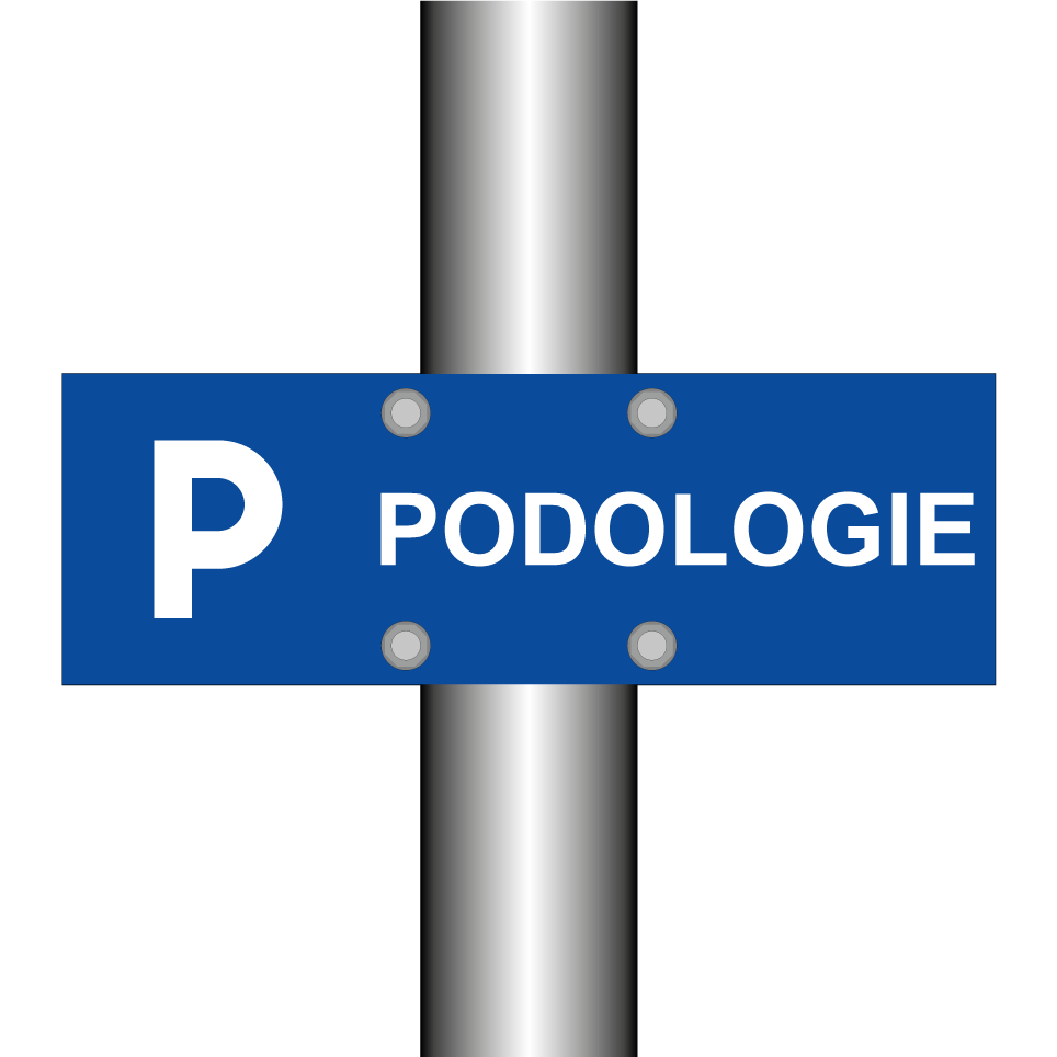 Panneau de stationnement avec le texte : "Podologie" et une symbolique claire.