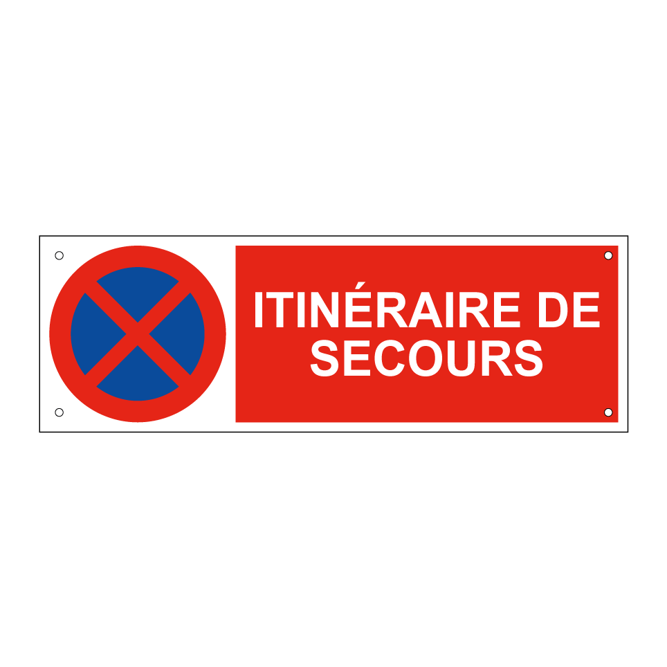 Panneau d'interdiction de stationner avec le texte : "Itinéraire de secours" et une symbolique claire.