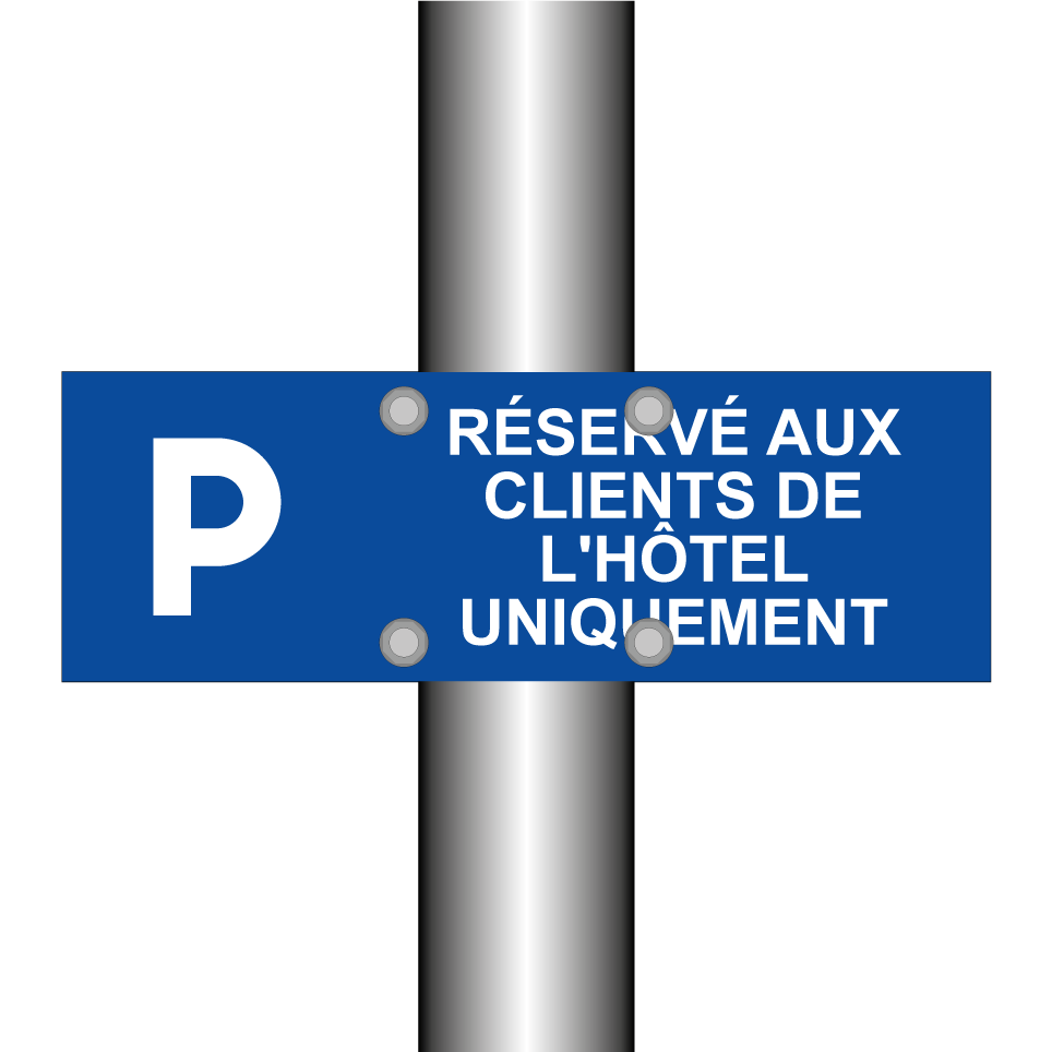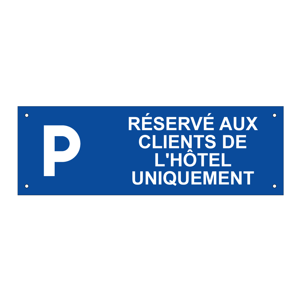 Ce panneau de stationnement est idéal pour les hôtels souhaitant réserver des places de parking exclusivement pour leurs clients. Grâce à son design clair avec un fond bleu et une écriture blanche, il est facilement visible et compréhensible. Placez-le à l'entrée du parking ou à proximité des zones de stationnement réservées pour garantir que seuls les clients de l'hôtel utilisent ces espaces. Ce panneau contribue à une gestion efficace du stationnement et améliore l'expérience client en assurant la disponibilité des places.