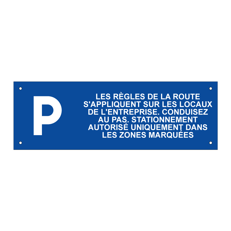 Ce panneau de stationnement est idéal pour les entreprises souhaitant réguler le trafic sur leurs locaux. Il est conçu pour être placé à l'entrée des parkings ou des zones de circulation lente, garantissant que les conducteurs respectent les règles de conduite et stationnent uniquement dans les zones désignées. Avec son fond bleu et son texte blanc, il est facilement visible et attire l'attention, assurant ainsi la sécurité et l'ordre sur votre site.