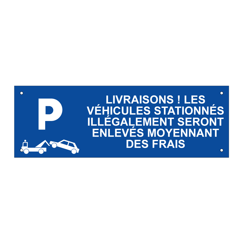Panneau de stationnement avec le texte : "Livraisons ! Les véhicules stationnés illégalement seront enlevés moyennant des frais." et une symbolique claire.