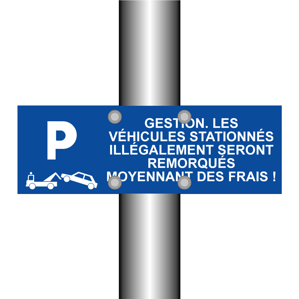 Panneau de stationnement avec le texte : "Gestion. Les véhicules stationnés illégalement seront remorqués moyennant des frais !" et une symbolique claire.