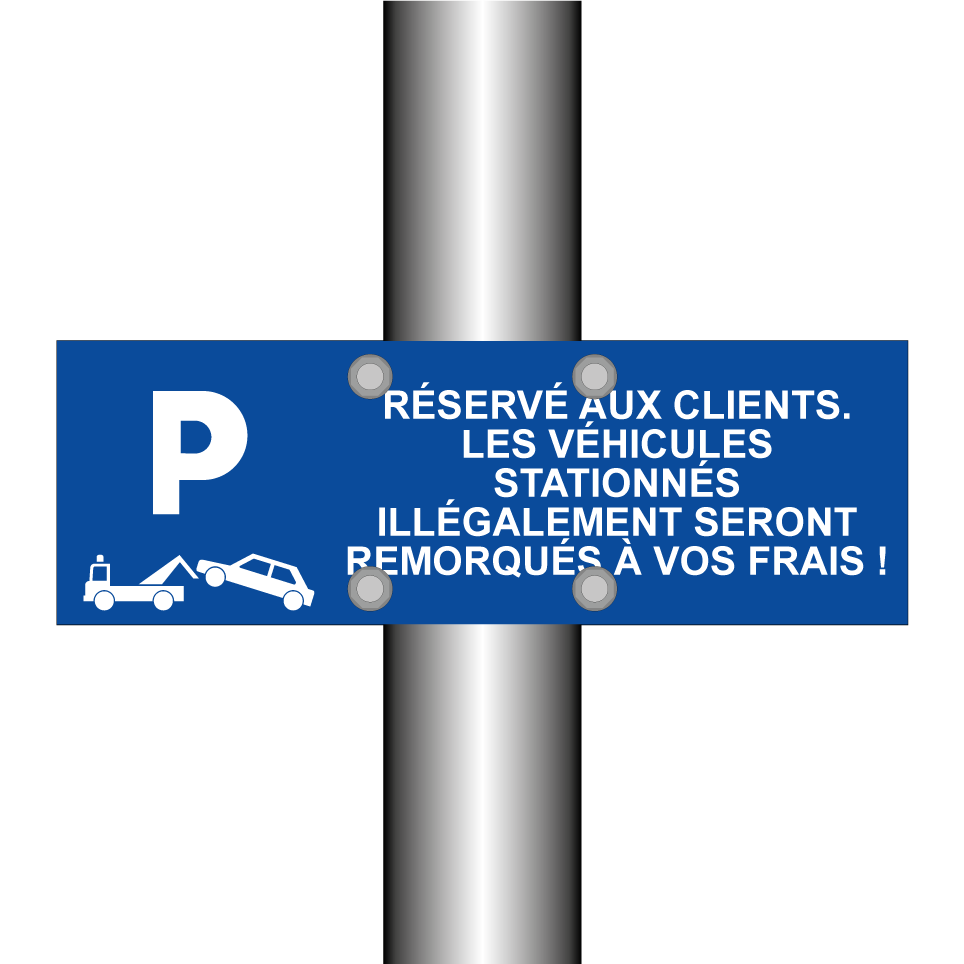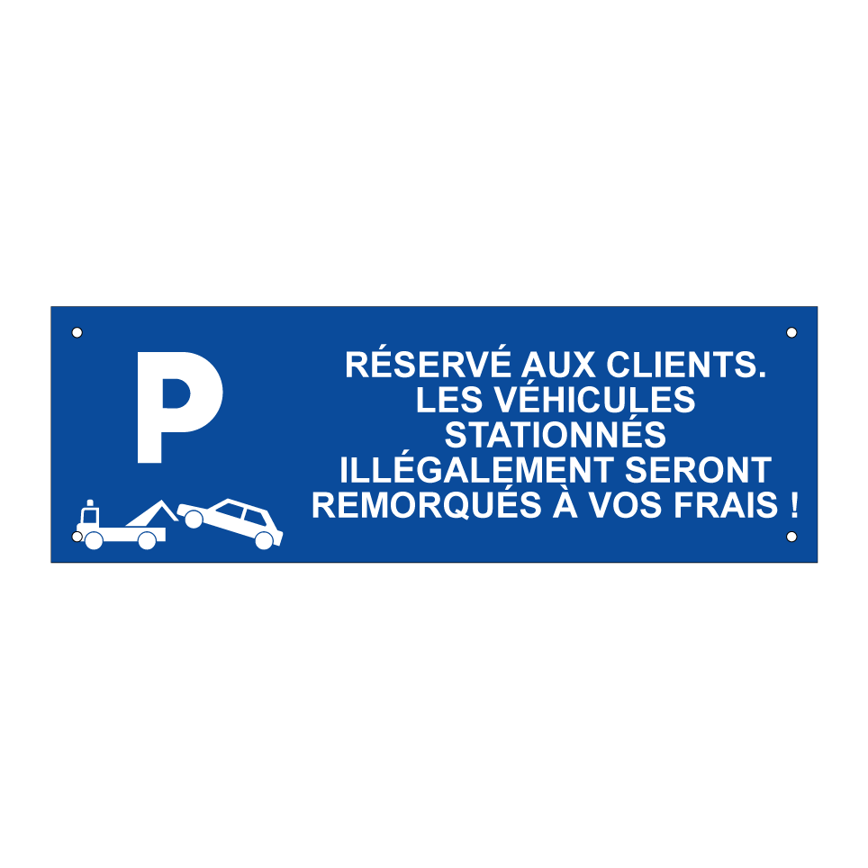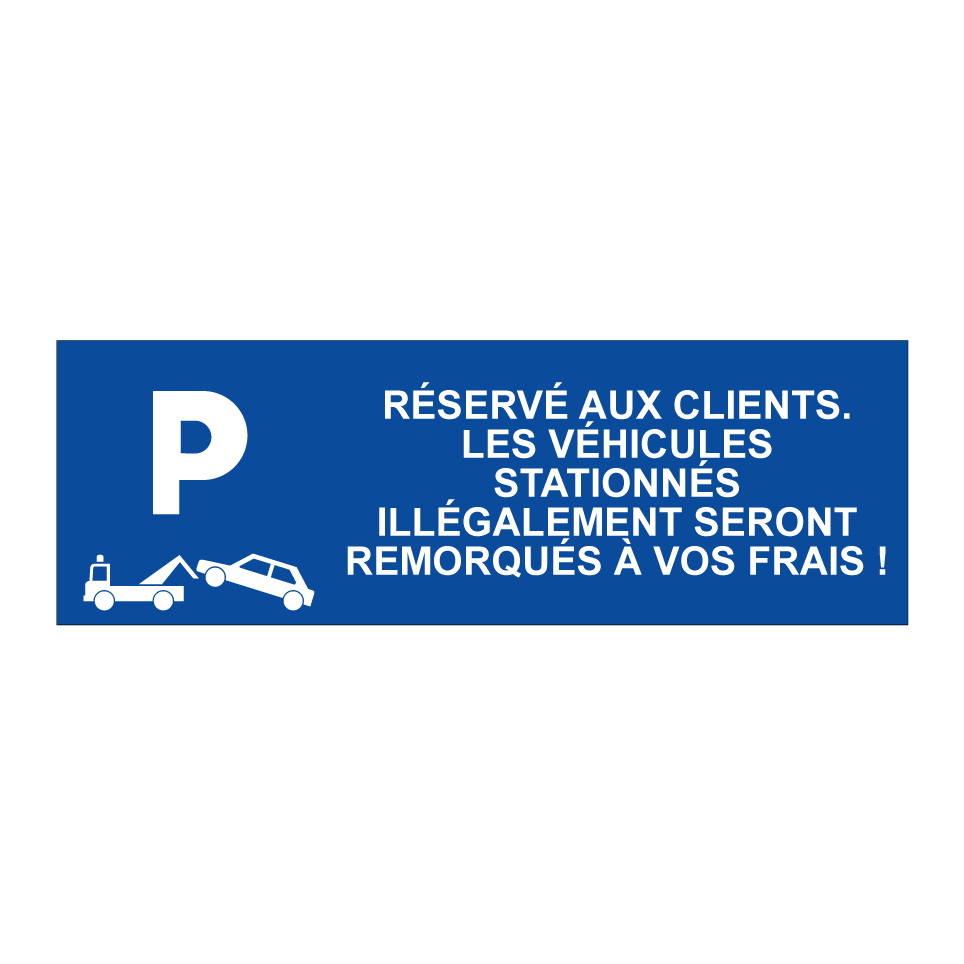 Panneau de stationnement avec le texte : "Réservé aux clients. Les véhicules stationnés illégalement seront remorqués à vos frais !" et une symbolique claire.