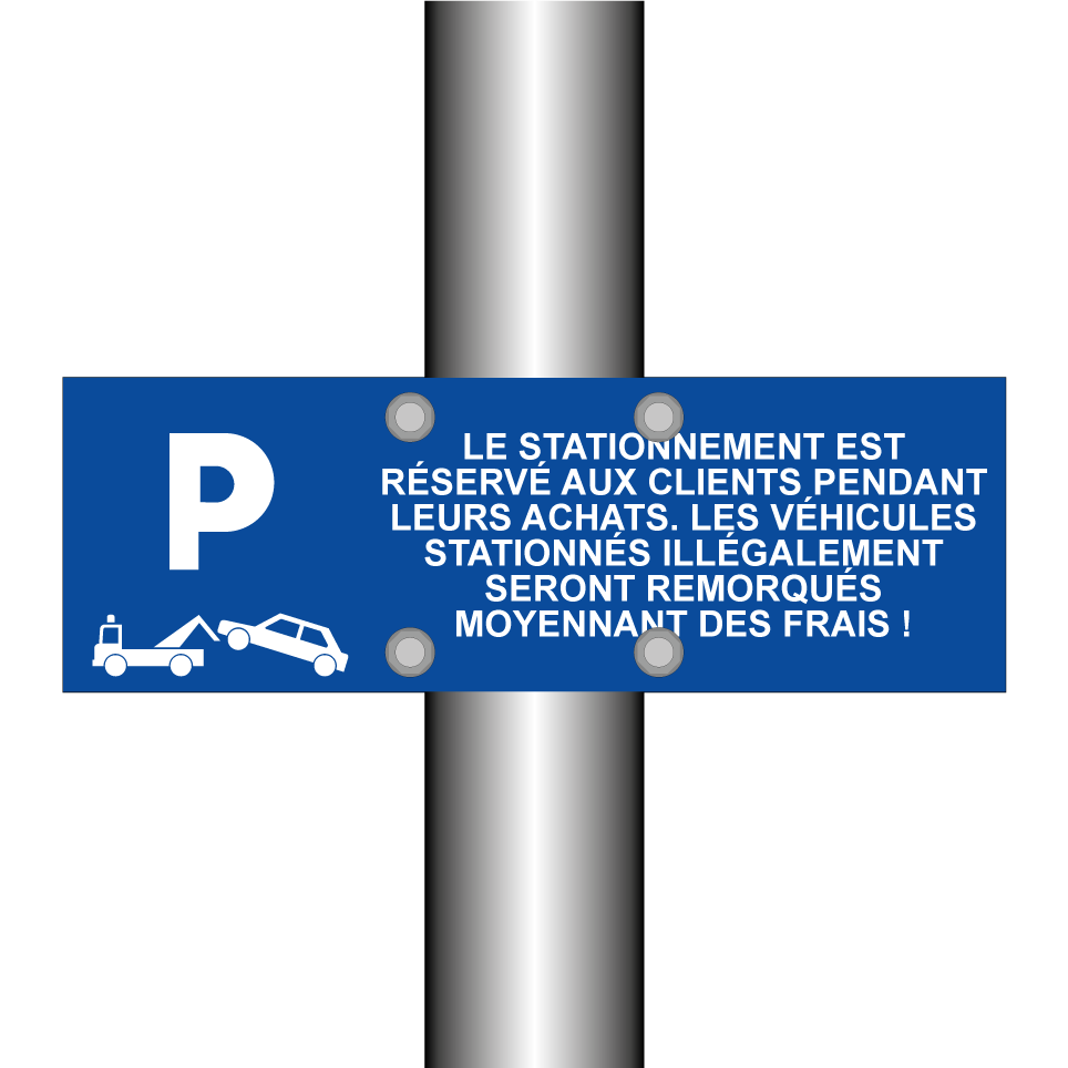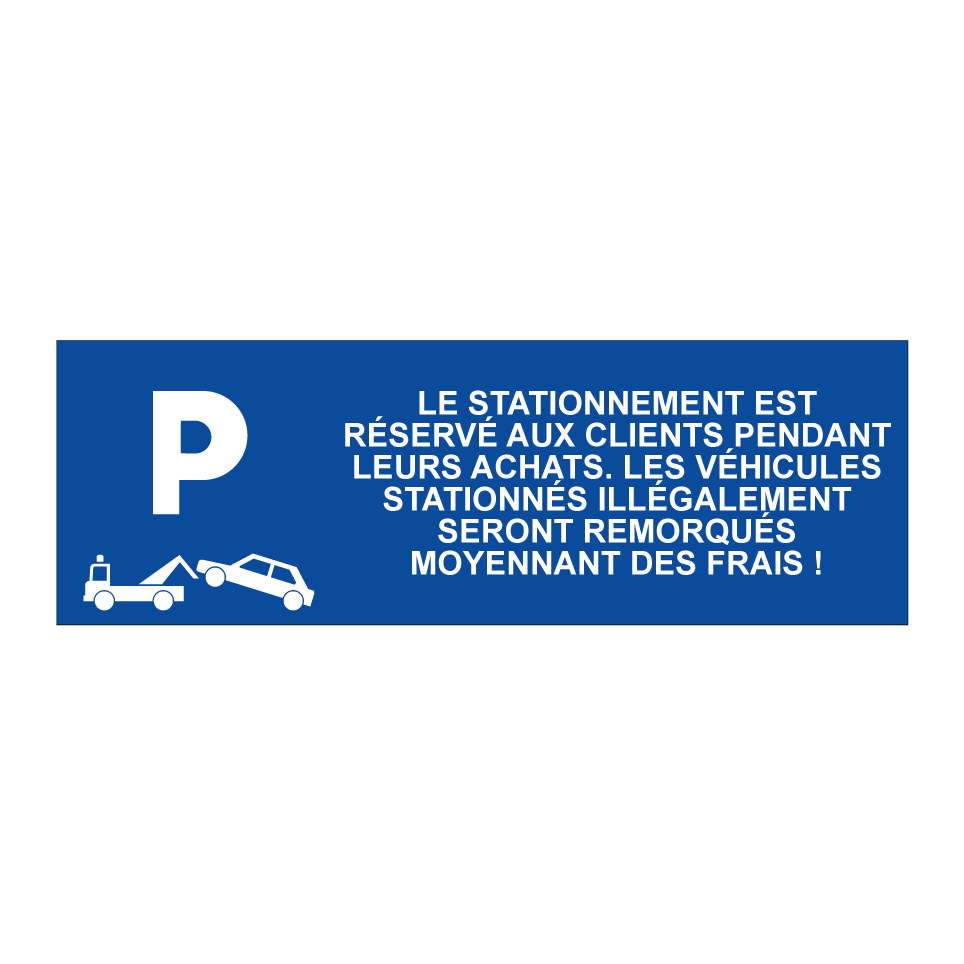 Panneau de stationnement avec le texte : "Le stationnement est réservé aux clients pendant leurs achats. Les véhicules stationnés illégalement seront remorqués moyennant des frais !" et une symbolique claire.