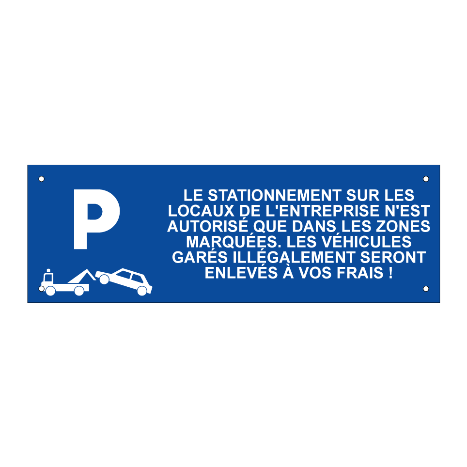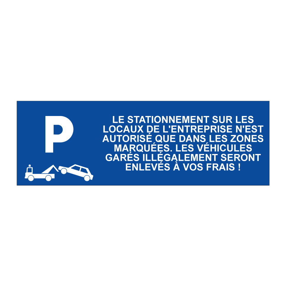 Panneau de stationnement avec le texte : "Le stationnement sur les locaux de l'entreprise n'est autorisé que dans les zones marquées. Les véhicules garés illégalement seront enlevés à vos frais !" et une symbolique claire.