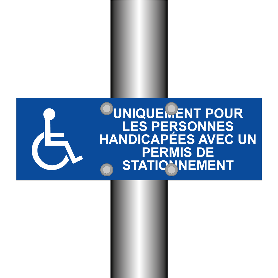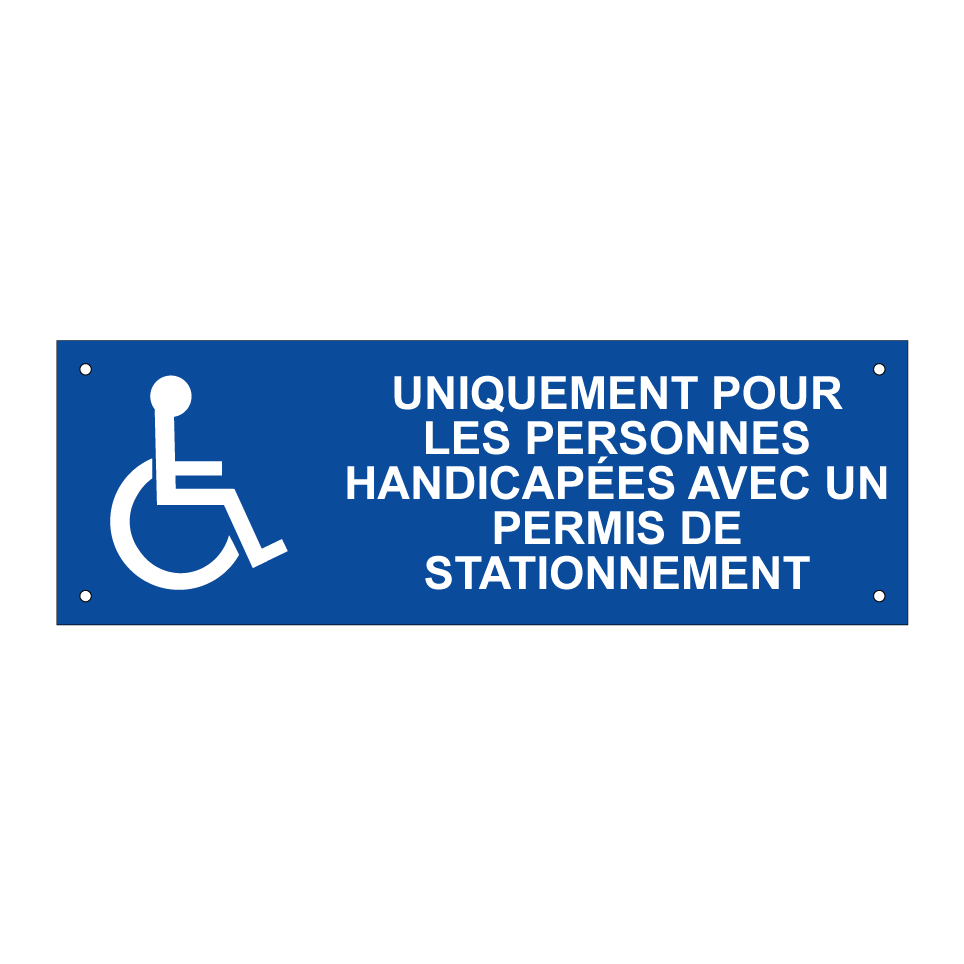 Ce panneau de stationnement réservé est idéal pour les zones de stationnement accessibles aux personnes handicapées. Il peut être installé dans les parkings publics, privés ou d'entreprise pour garantir que les places de stationnement sont utilisées correctement par ceux qui en ont besoin. Avec son fond bleu et son texte blanc clair, il est facilement visible et reconnaissable. Ce panneau assure le respect des règles de stationnement pour les détenteurs de permis spéciaux, contribuant ainsi à une meilleure accessibilité.