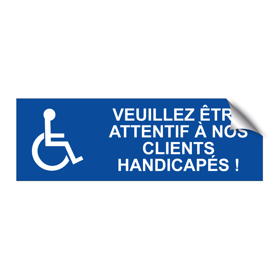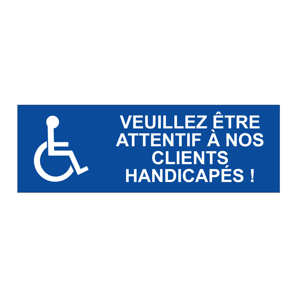 Panneau de stationnement avec le texte : "Veuillez être attentif à nos clients handicapés !" et une symbolique claire.