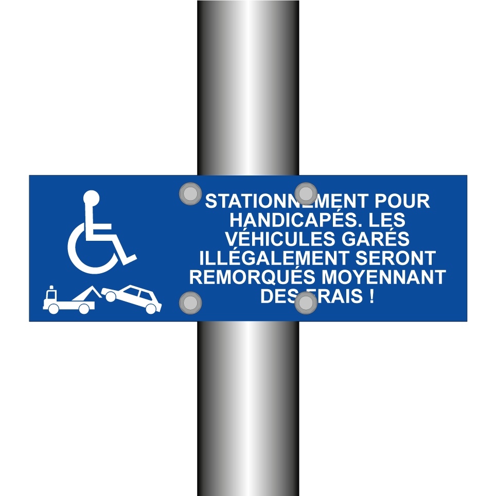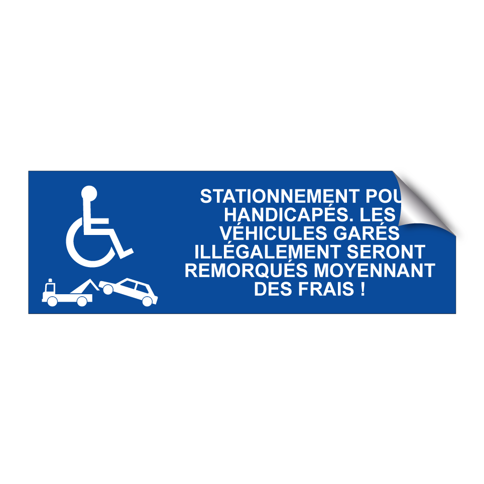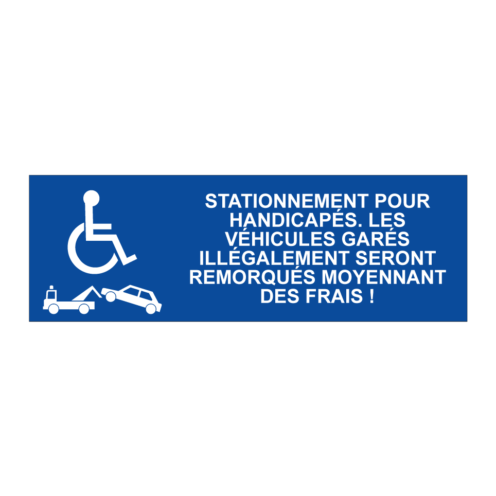 Panneau de stationnement avec le texte : "Stationnement pour handicapés. Les véhicules garés illégalement seront remorqués moyennant des frais !" et une symbolique claire.