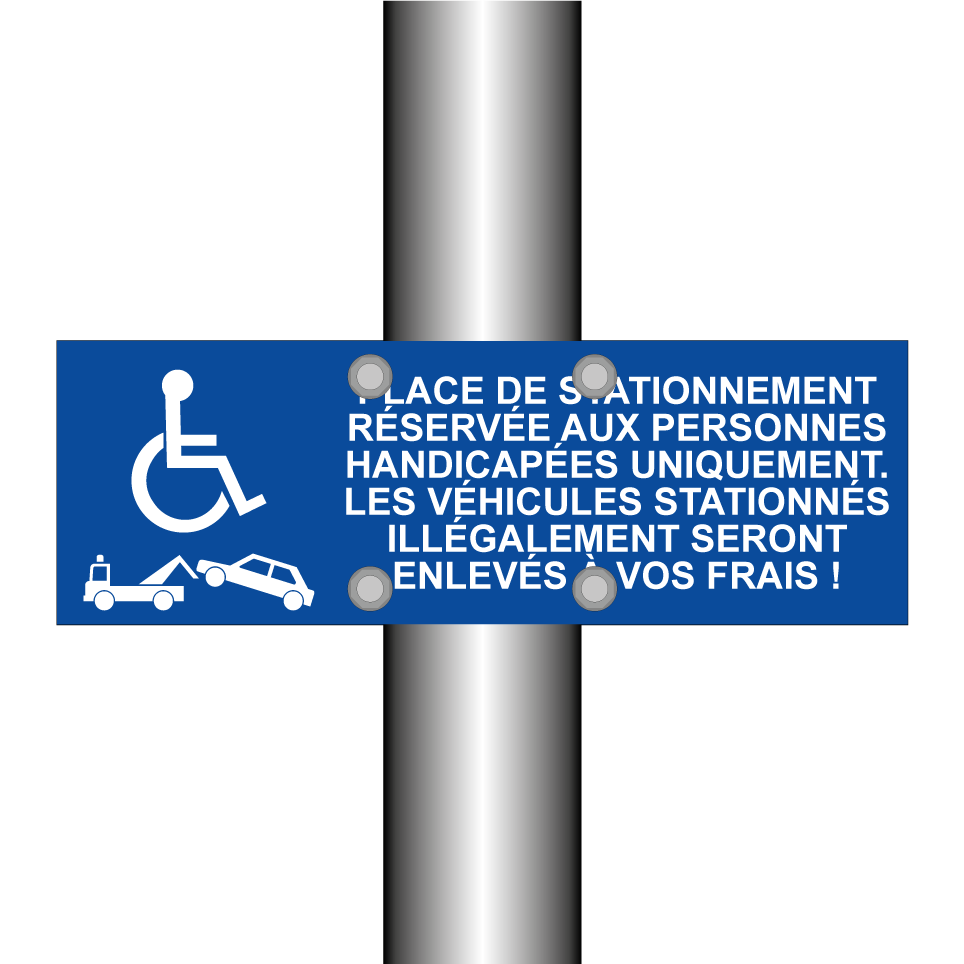 Panneau de stationnement avec le texte : "Place de stationnement réservée aux personnes handicapées uniquement. Les véhicules stationnés illégalement seront enlevés à vos frais !" et une symbolique claire.