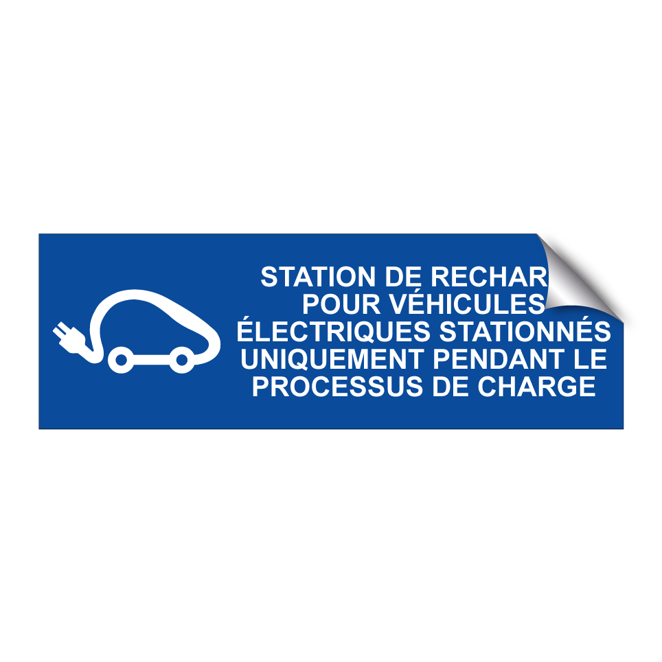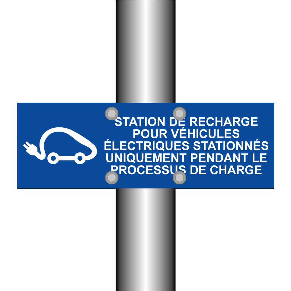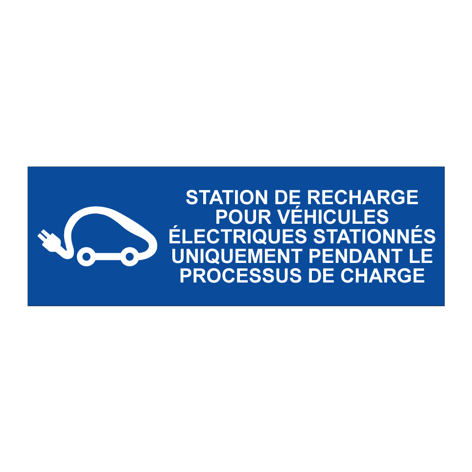 Panneau de stationnement avec le texte : "Station de recharge pour véhicules électriques stationnés uniquement pendant le processus de charge" et une symbolique claire.
