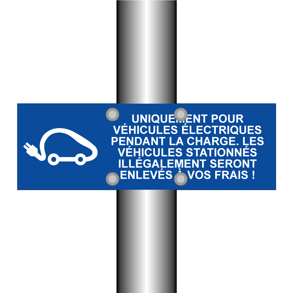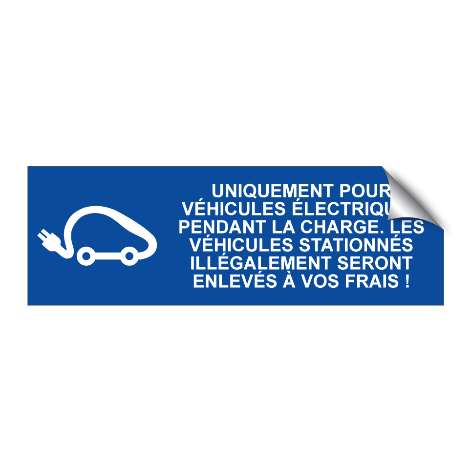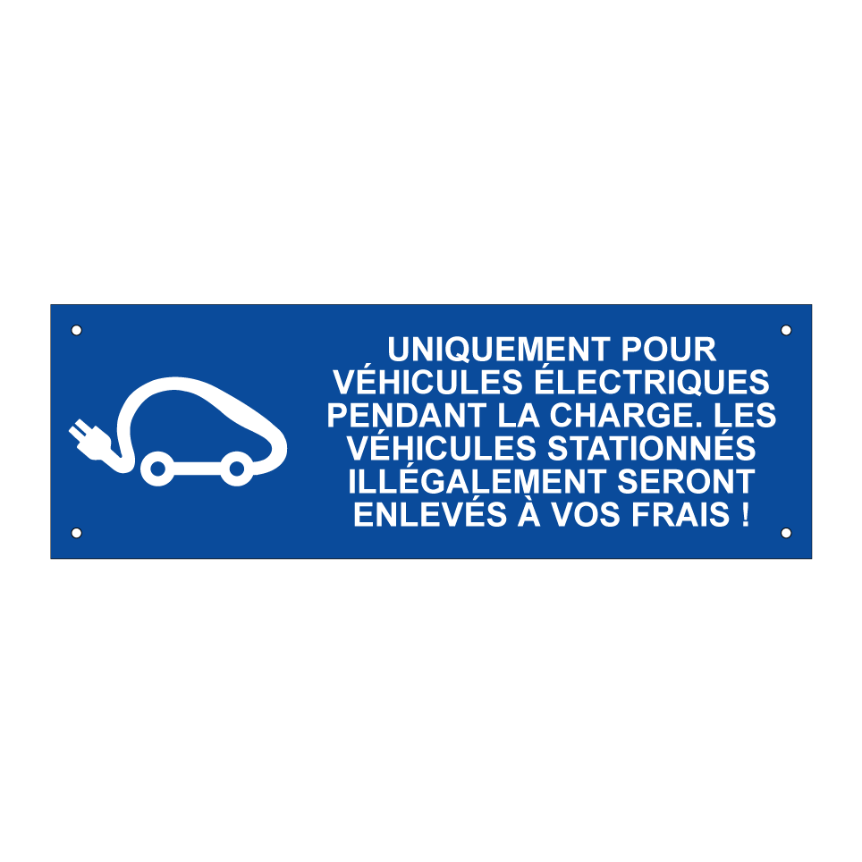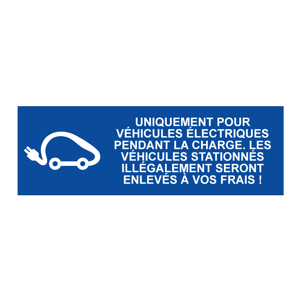 Panneau de stationnement avec le texte : "Uniquement pour véhicules électriques pendant la charge. Les véhicules stationnés illégalement seront enlevés à vos frais !" et une symbolique claire.